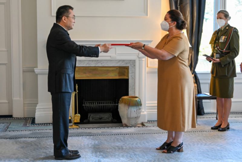 2月22日上午,中国驻新西兰大使王小龙(左)在总督府向新西兰总督辛迪·基罗(右)递交国书。(图/中国驻新西兰大使馆官网)