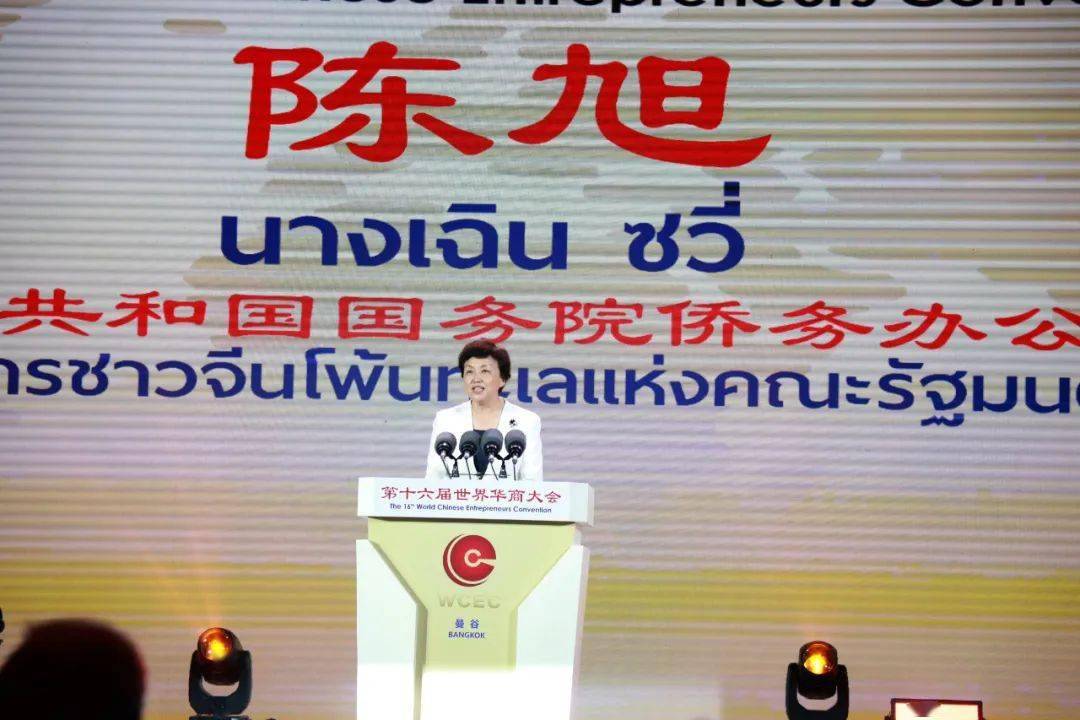 第16届世界华商大会于当地时间24至26日在泰国曼谷举行。6月24日晚,第16届世界华商大会举行欢迎大会,欢迎来自全球50多个国家的与会嘉宾。中国国务院侨务办公室主任陈旭出席欢迎大会并致辞。
