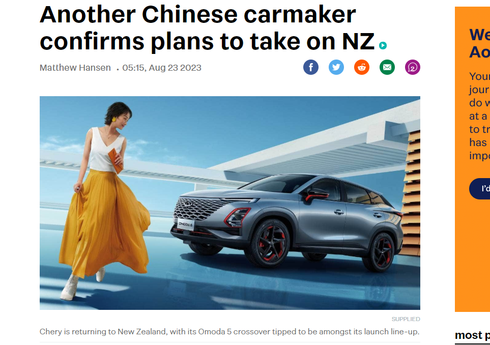 奇瑞近日宣布进入新西兰市场的计划。(图/Stuff网站截图)