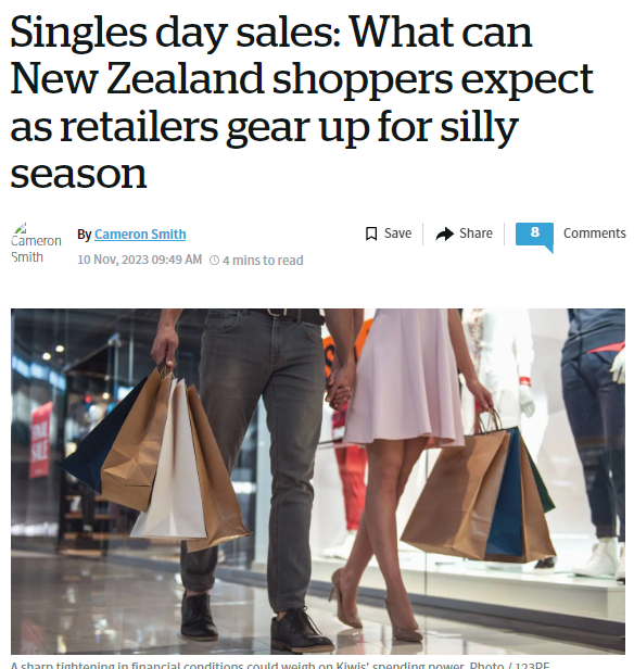 【乡音网编译报道】距离圣诞节还有6周,在中国被称为“光棍节”的11月11日,也叫“双11”,将成为新西兰下一个大型促销活动。