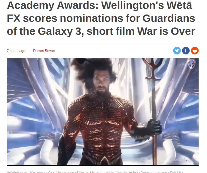 新西兰惠灵顿的维塔视效工作室(Wētā FX)获得第96届奥斯卡金像奖2项提名。(图/Newshub网站截图)