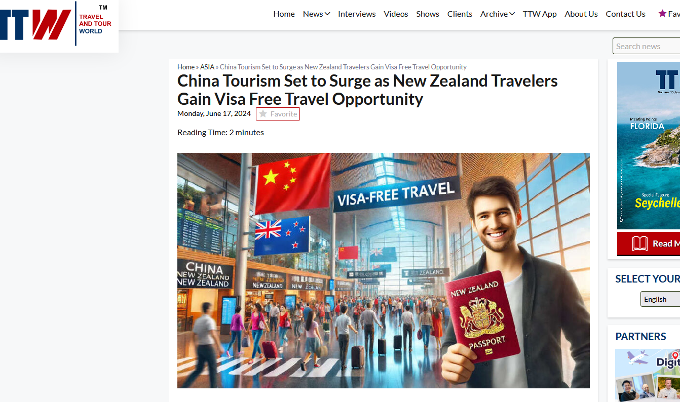 中国将对新西兰单方面免签政策将使大批新西兰游客赴华旅行。(图/Travel and Tour world网站截图)