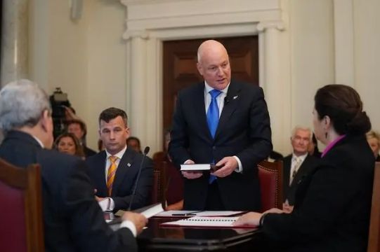 2023年11月27日,在新西兰首都惠灵顿,国家党领导人克里斯托弗·拉克森(中)参加宣誓就职仪式。拉克森当日宣誓就职新西兰总理。(图/新华社)