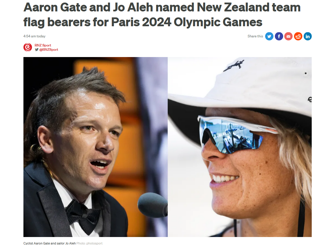 【乡音网编译报道】场地自行车运动员盖特(Aaron Gate)和帆船运动员阿莱(Jo Aleh)被任命为2024年巴黎奥运会新西兰队的旗手。