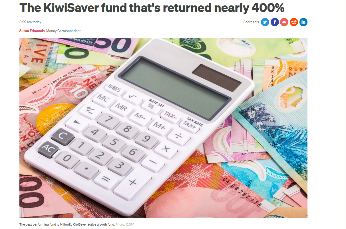 RNZ28日报道,据Morningstar data排名,排名第一的是Milford的KiwiSaver主动型成长基金——自成立以来,该基金的年化增长率为11.65%,累计增长率为385.67%。