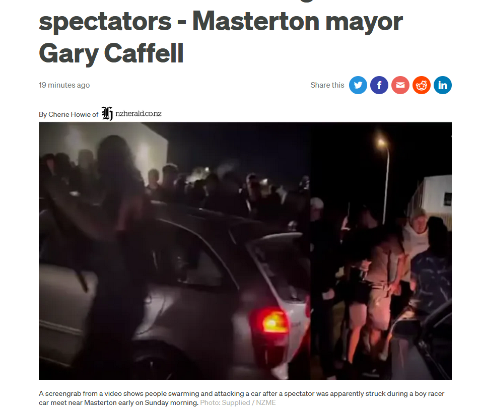 27日,怀拉拉帕地区马斯特顿镇附近的暴力非法赛车活动现场。(图/RNZ网站截图)