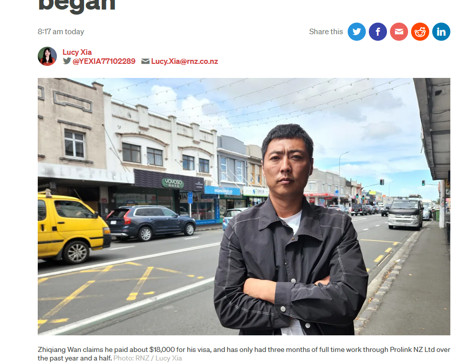 RNZ6日报道,至少有100名中国移民工人持有Prolink NZ Ltd的雇主工作签证(AEWV),但有些人仍然失业,而另一些人则没有足够的工作时间来维持生计。
