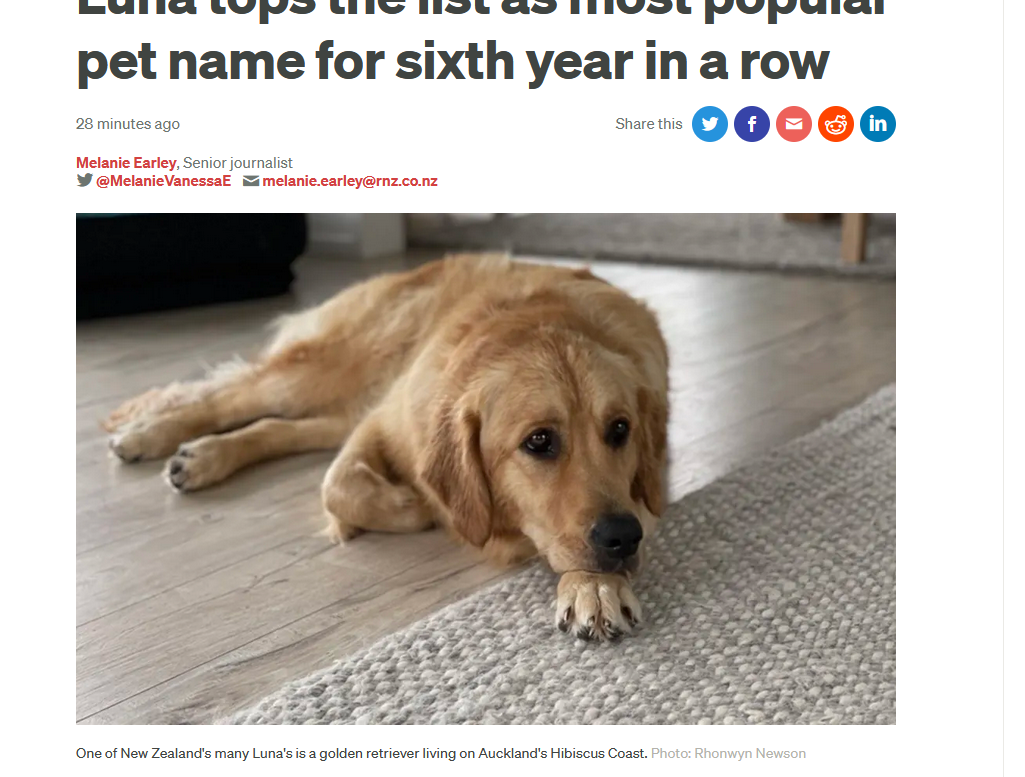 【乡音网编译报道】如果你认为给你心爱的小狗或小猫起名叫露娜(Luna),名字是很小众的,那你就错了——因为这是新西兰连续第六年最受欢迎的宠物名字。