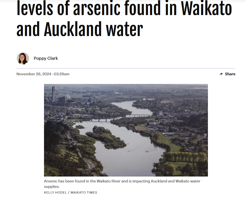“我们每月对怀卡托河进行淡水检测。上次检测是在11月7日进行的,当时砷含量并无异常。这些含量通常高于饮用水标准,这就是为什么在向家庭供应饮用水之前需要进行处理的原因。”