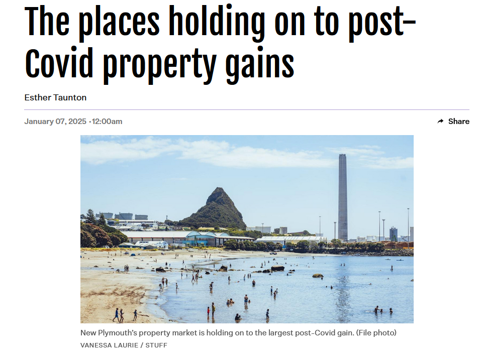 2024年12月,新普利茅斯的房价中位数为698364元(新西兰元,下同),自新冠疫情后的房价峰值以来仅下跌了1.9%。