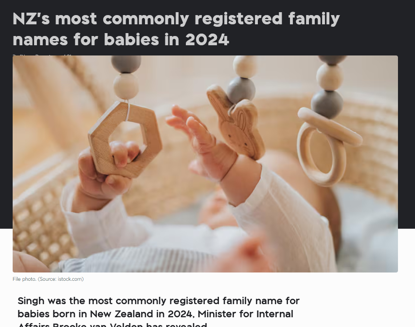 【乡音网编译报道】2024年新西兰最常见的婴儿注册姓氏榜单近日公布。内政部长范·韦尔登(Brooke van Velde)介绍说,“辛格(Singh)”是2024年在新西兰出生的婴儿中登记最多的姓氏。