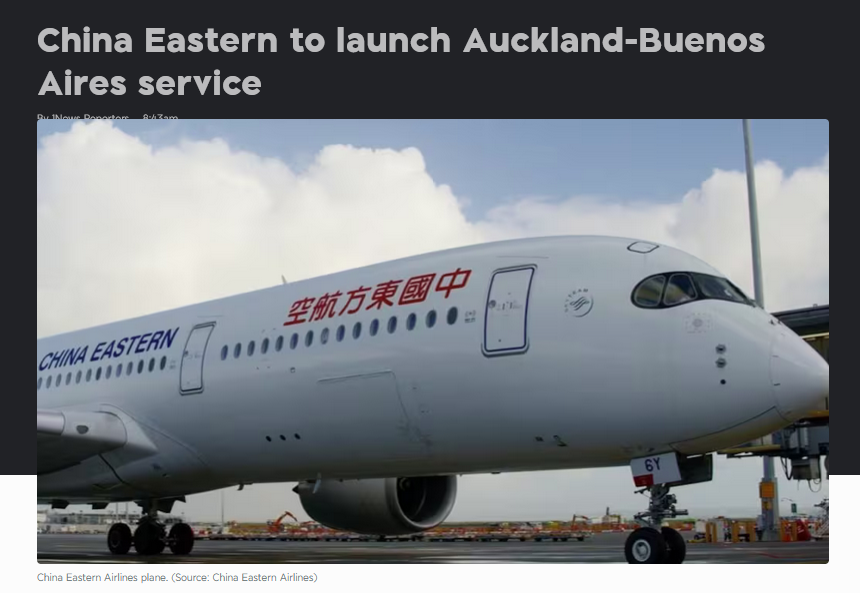 1News19日报道,据悉,东航这家已运营中国至奥克兰航线超十年的航空公司,拟从2025年12月起,开通以上海浦东机场为枢纽(起点),经奥克兰机场中转至布宜诺斯艾利斯埃塞萨机场的航线。