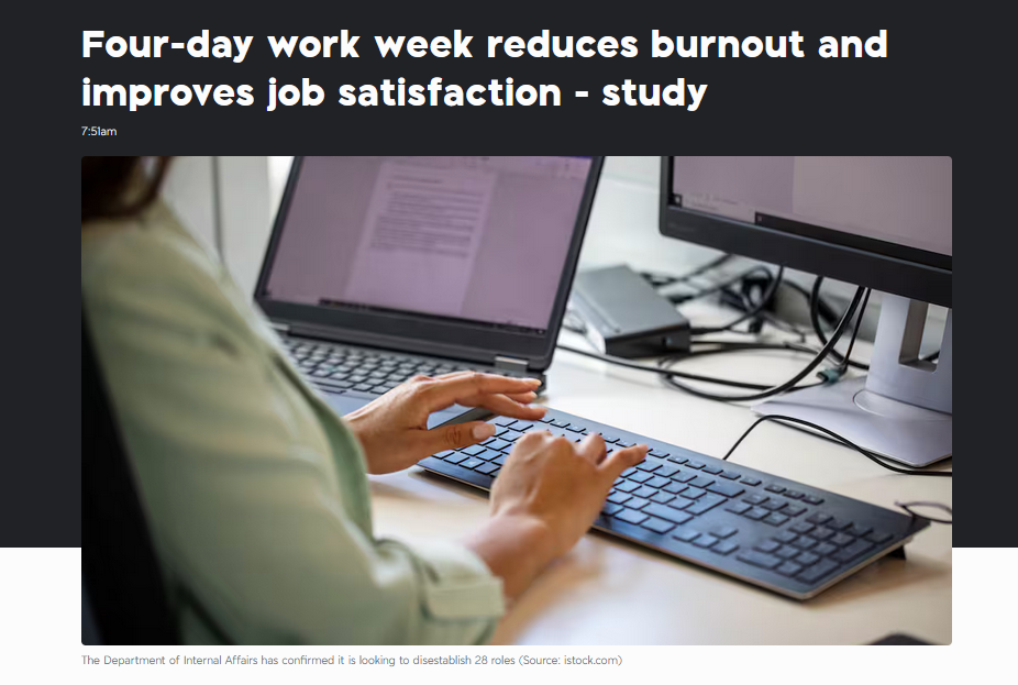 RNZ22日报道,这项来自美国波士顿学院的研究,测试了在不减薪的情况下缩短员工工作时长至每周四天所产生的影响。