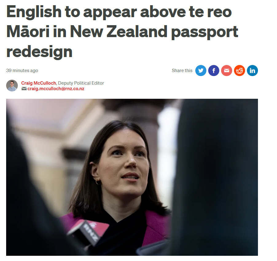 【乡音网编译报道】新西兰内政部长费尔登(Brooke van Velden)25日证实,新西兰护照正进行重新设计,将会把英文文字置于毛利文字上方,但新设计要到2027年底才会开始逐步推出。