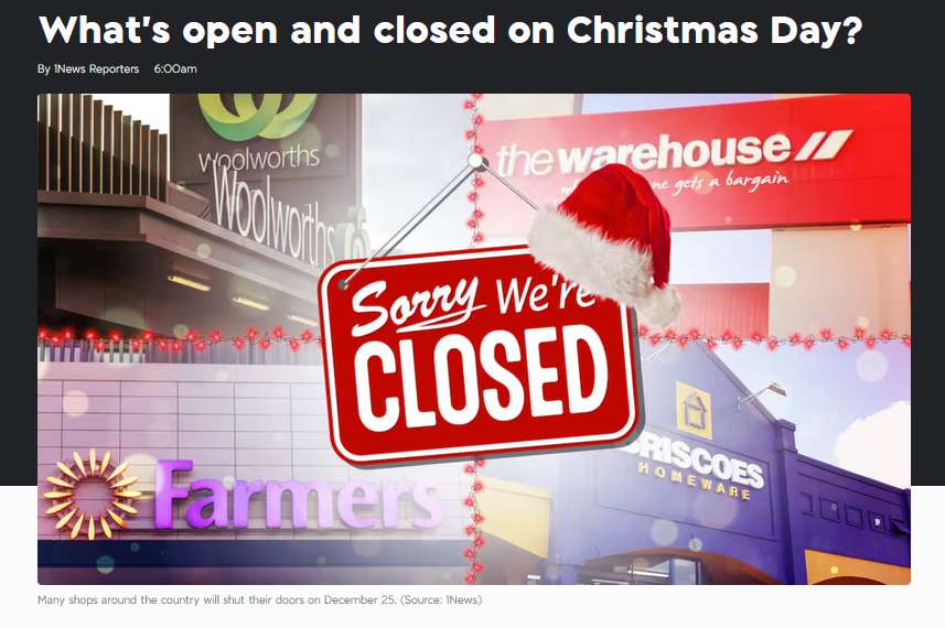 这也就意味着,如果你临时想买烤鸡,那恐怕要失望了——Woolworths、New World和Pak’nSave等大型连锁超市将在全国范围内停业。要是你忘了买某样食材,最佳选择是便民店或小型便利店,许多这类店铺会选择在圣诞节当天缩短营业时间营业。
