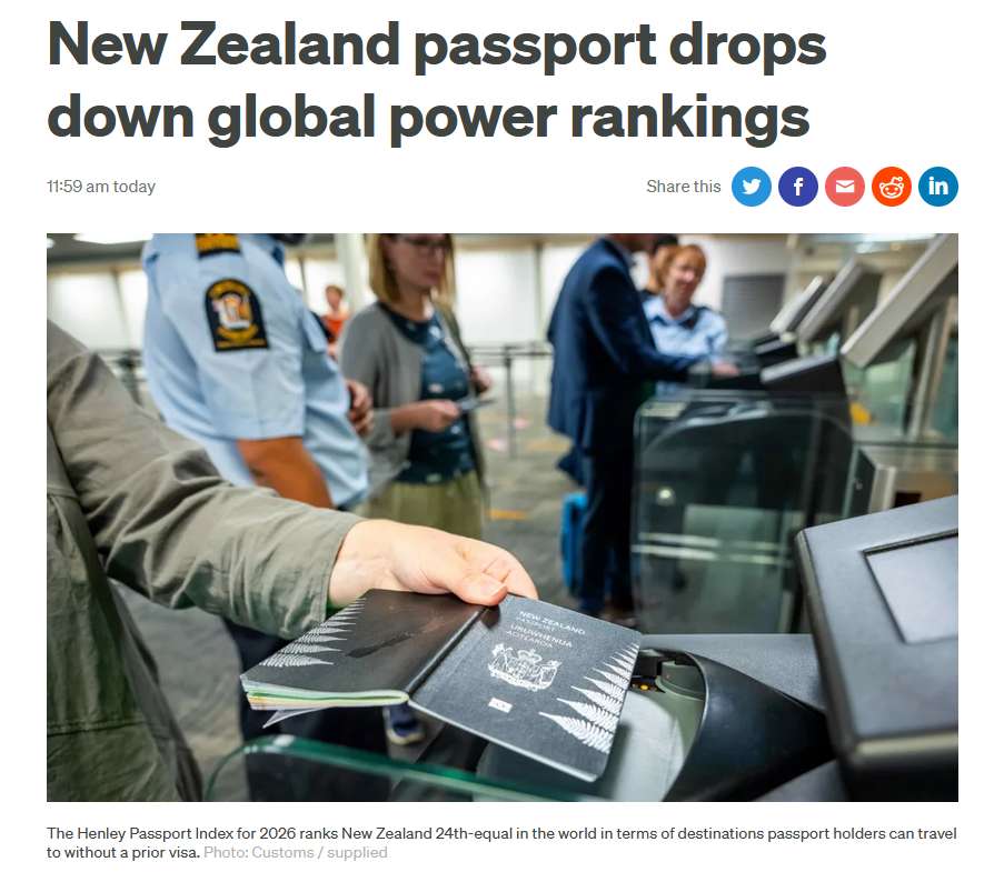 2026年亨利护照指数近日出炉,结果显示,新西兰护照的“含金量”较去年有所下降。(图/RNZ网站截图)