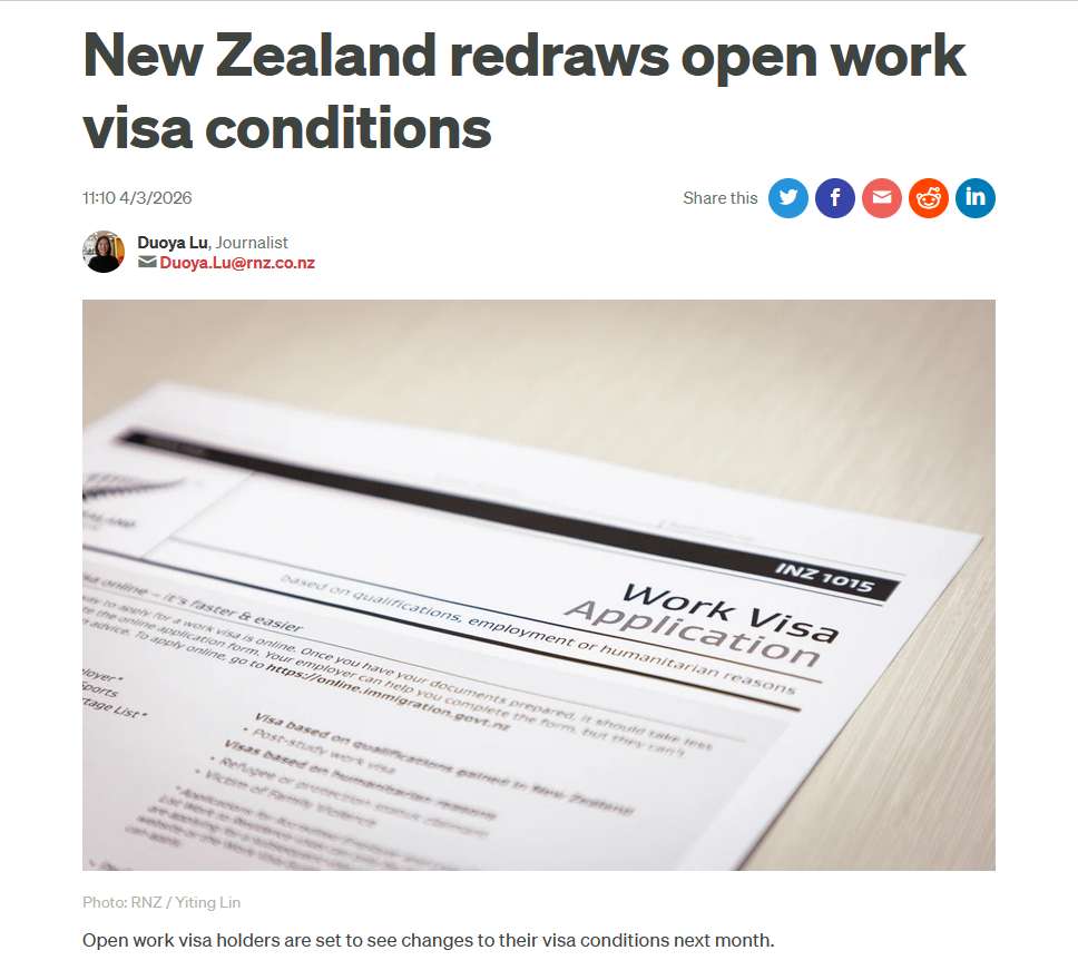 RNZ4日报道,开放式工作签证通常允许持有人在新西兰绝大多数行业与地区,为几乎任何雇主工作,且无需事先获得工作录用通知。不过,新西兰移民局宣布,自4月20日起,开放式工作签证将新增两类就业条款。