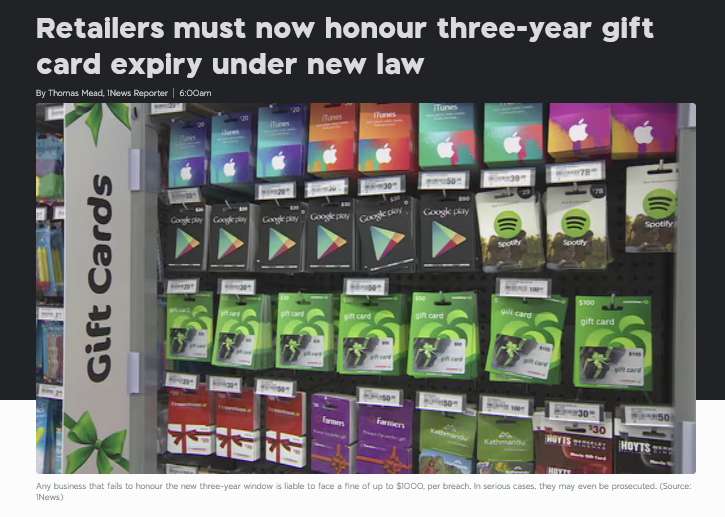 根据16日生效的新法案,新西兰所有零售商为顾客提供的礼品卡使用期限不得少于三年。(图/1News网站截图)
