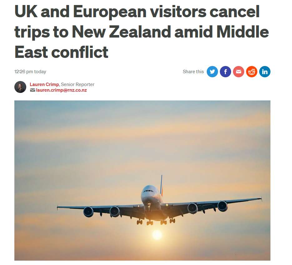 受中东战事持续导致的航班中断影响,新西兰旅游运营商正遭遇国际游客退订。(图/RNZ网站截图)