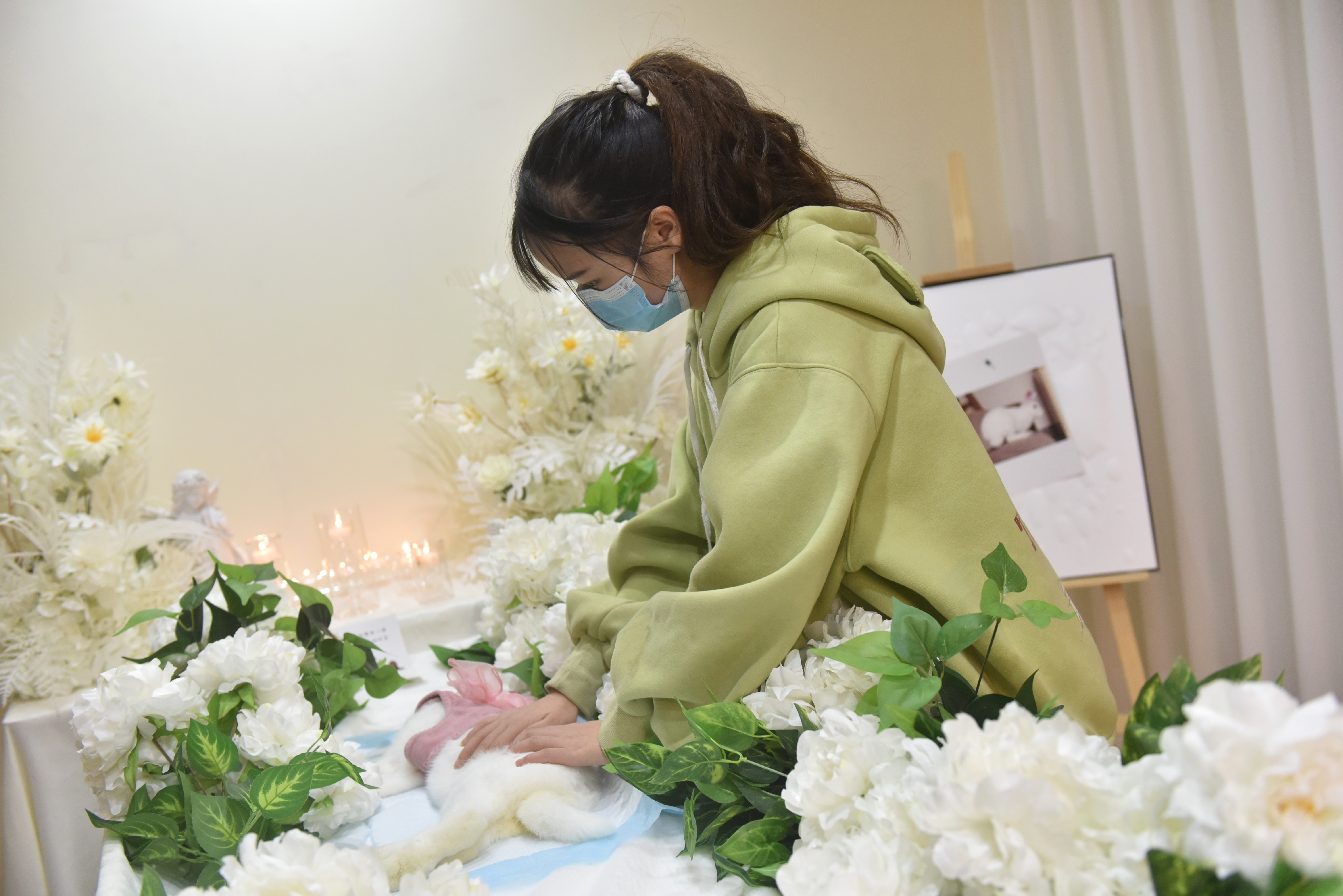 4月5日,长沙一家宠物殡葬中心的宠物殡葬师为宠物的骨灰寄存室献花。(中新社)
