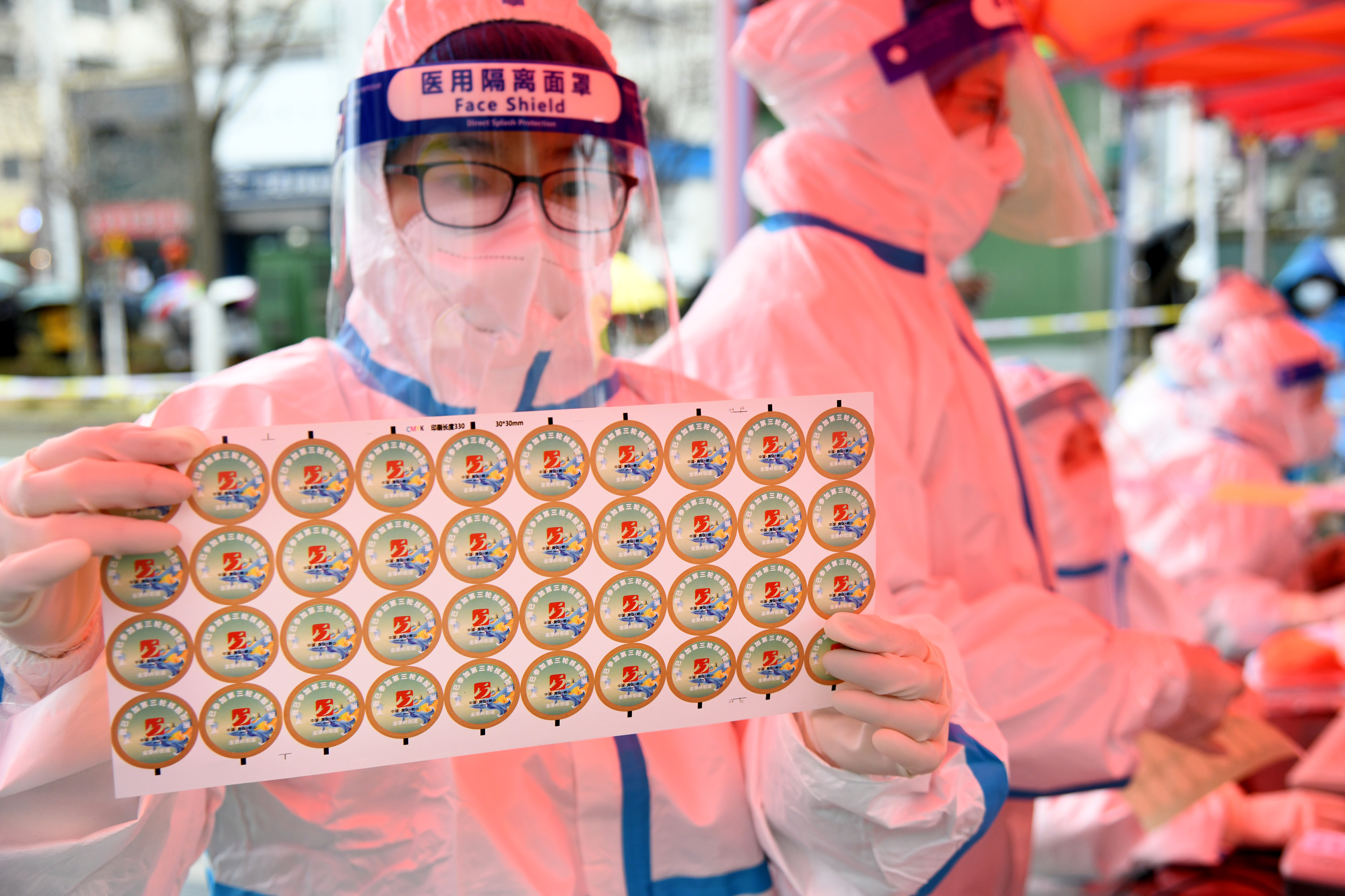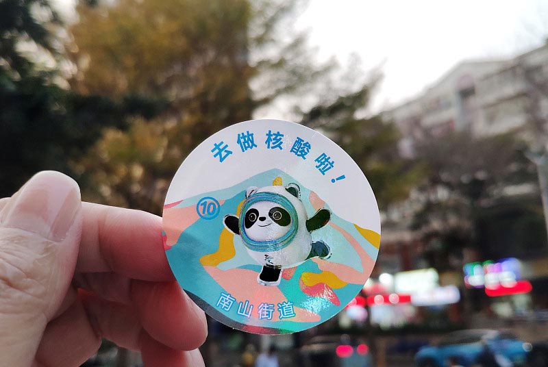 青岛市崂山区麦岛广场一核酸采样点的工作人员展示“中国风”贴纸,已接受采样的市民可获得贴纸。(新华社)