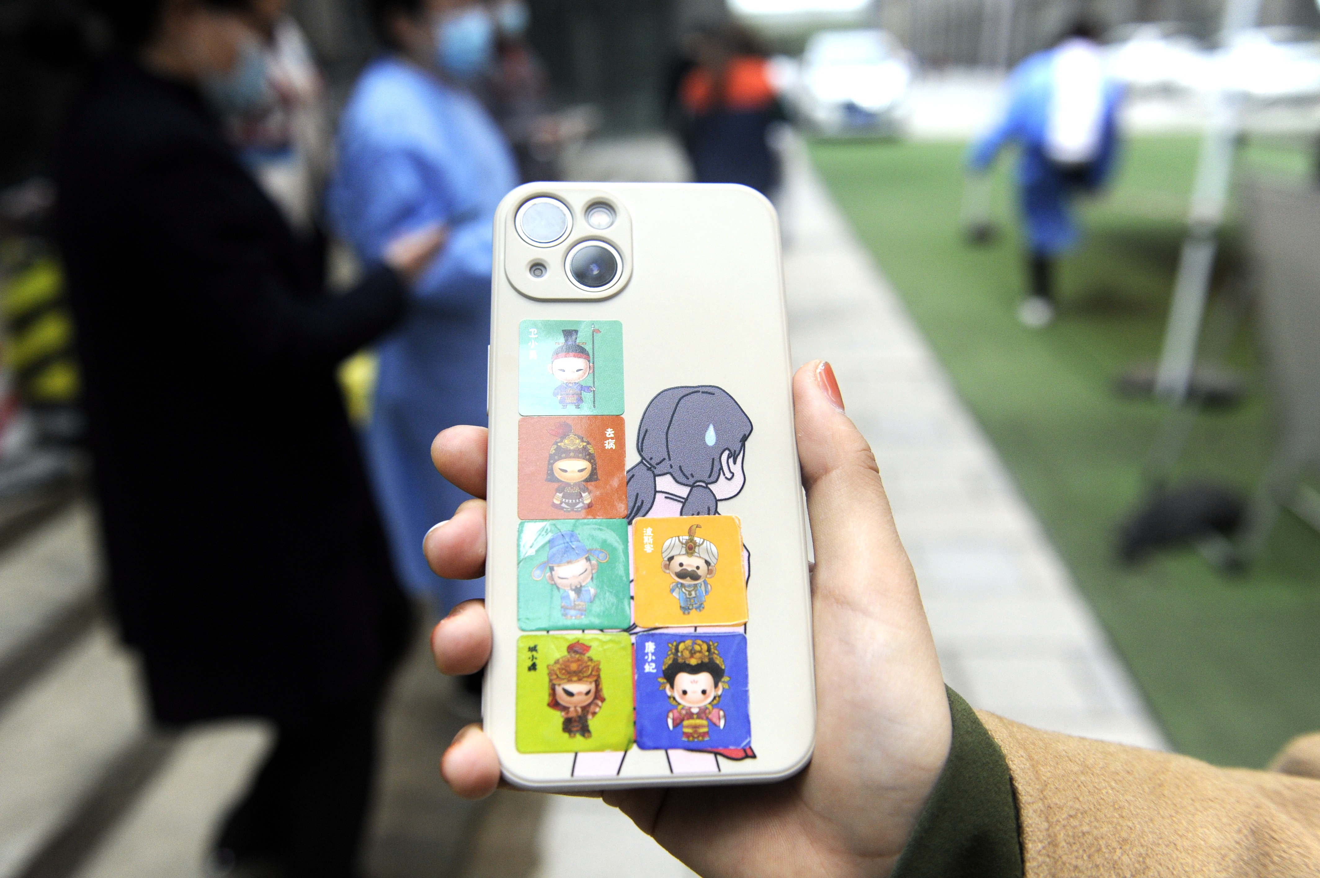 西安市民展示贴在手机背后的贴纸。作为疫情防控的重要措施,多轮核酸筛查在西安市先后展开。从“秦岭四宝”到“唐小妃”“李小白”,作为核酸检测结果出来之前的有效凭证,民众在完成核酸检测后领到的贴纸成了这座城市的新“网红”。(中新社)