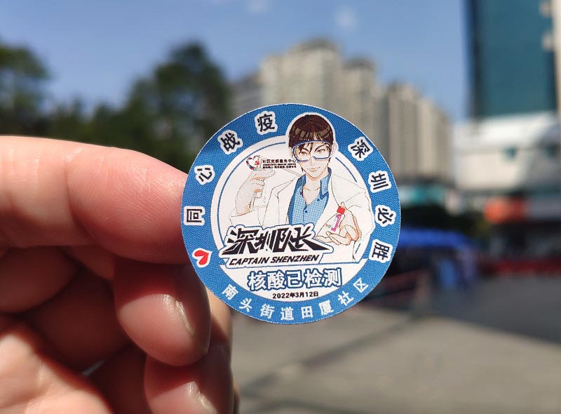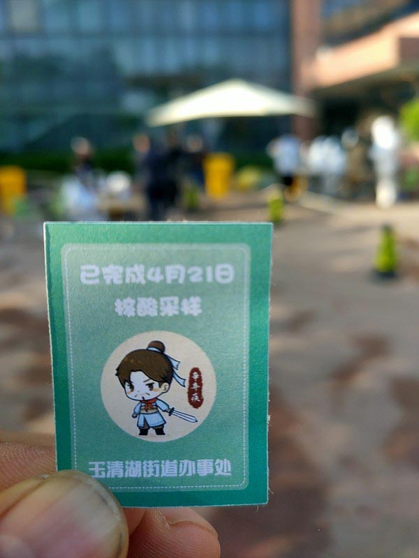 图为深圳南山区南头街道田厦社区核酸检测后发的核酸贴纸。(CFP)