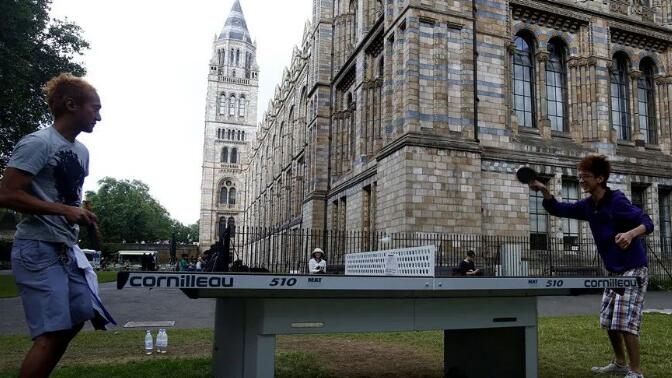 两名乒乓球爱好者在伦敦街头切磋技艺。(图/中新社)