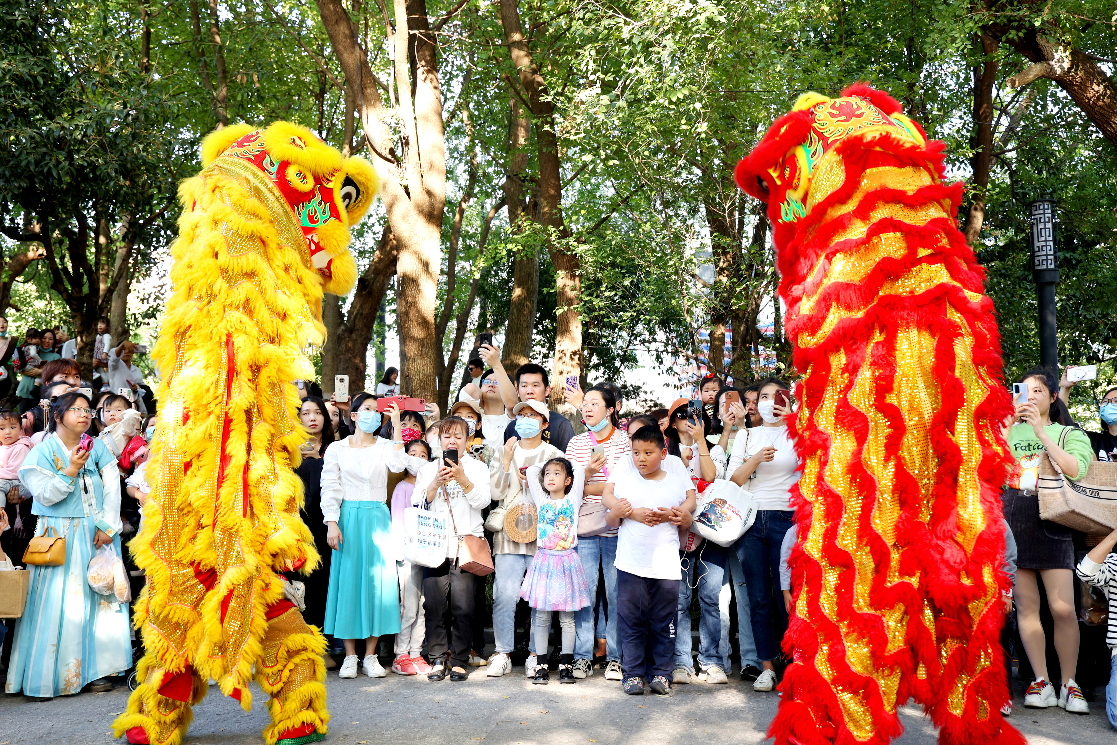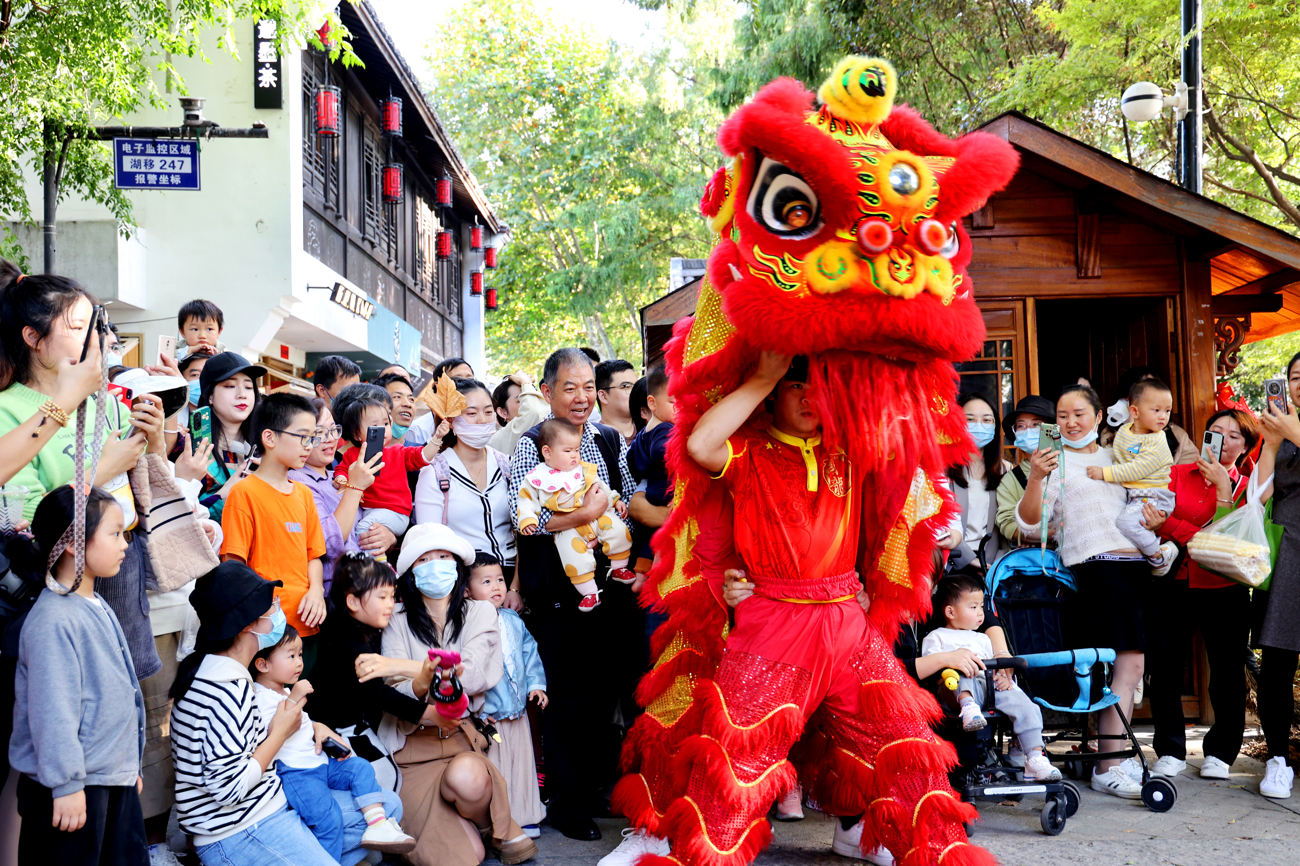 11月10日,浙江杭州第九届中国大运河庙会大兜路历史文化街区内,“国潮文创集市”“轻食美食集市”“非遗集市”热闹非凡,吸引了众多市民游客前来参加。图为浙江杭州第九届中国大运河庙会大兜路历史文化街区进行精彩的舞狮表演,赢得观众阵阵喝彩声。(中新网)