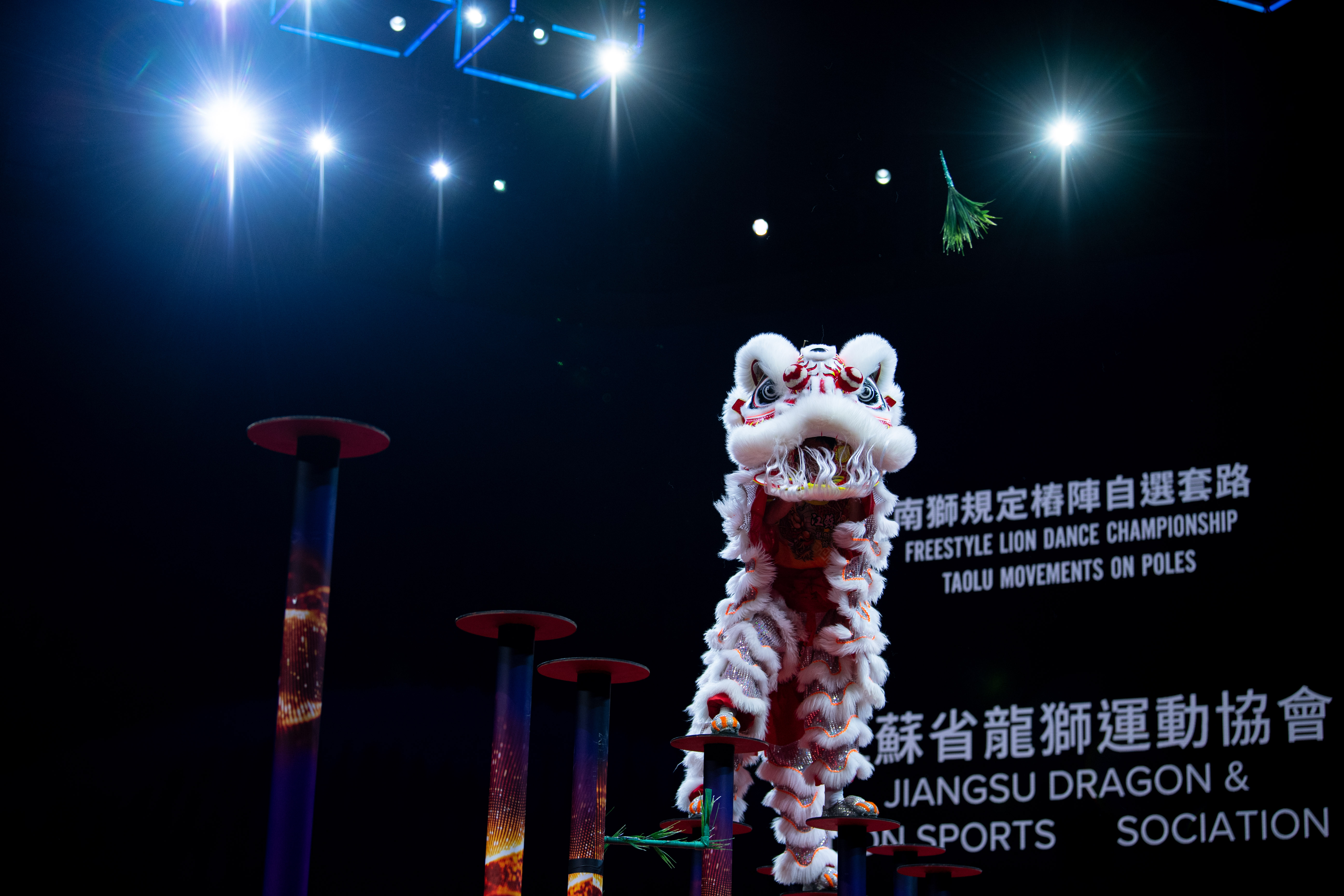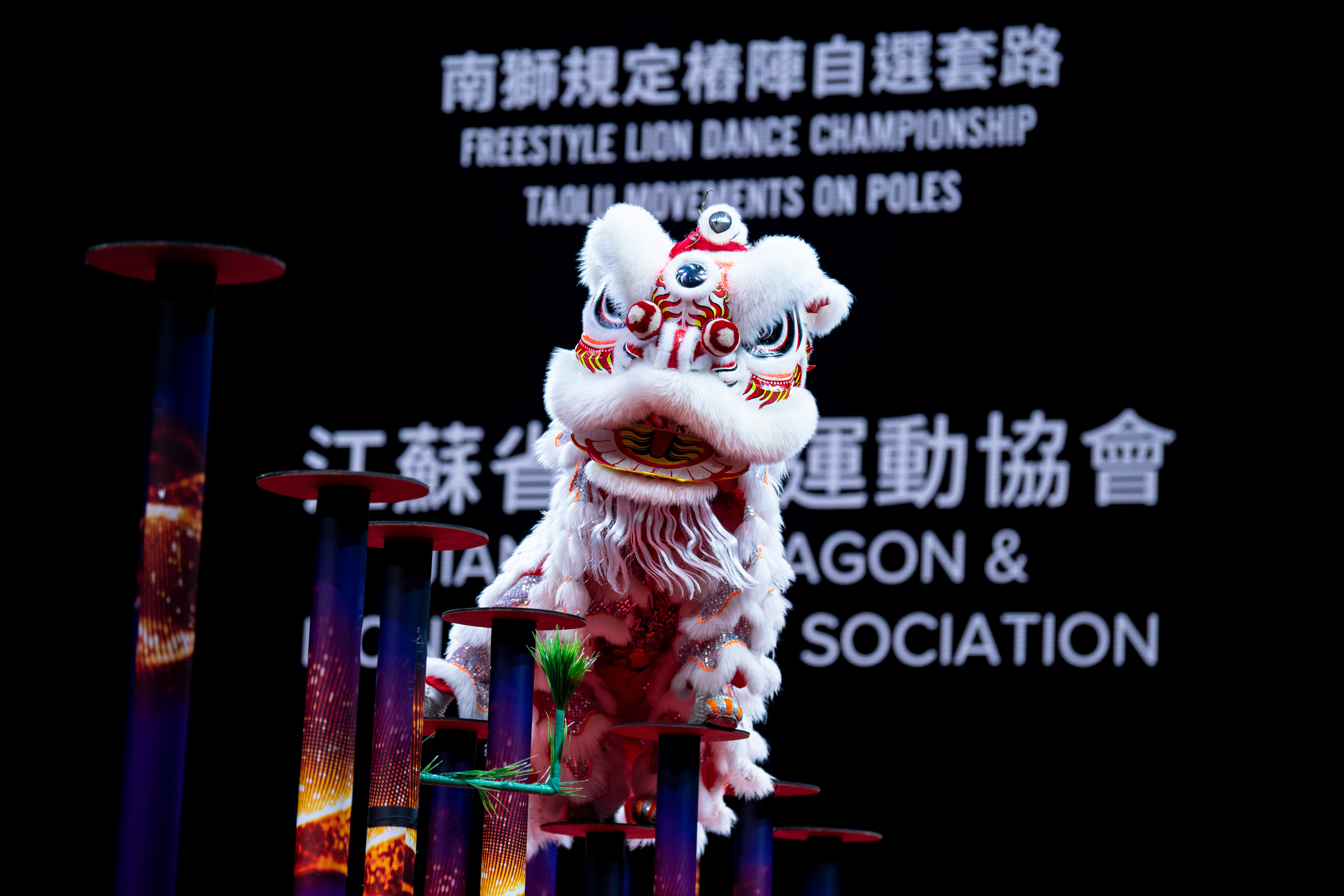 11月27日,参赛队伍在南狮规定桩阵自选套路第一回合比赛中。(香港中通社)