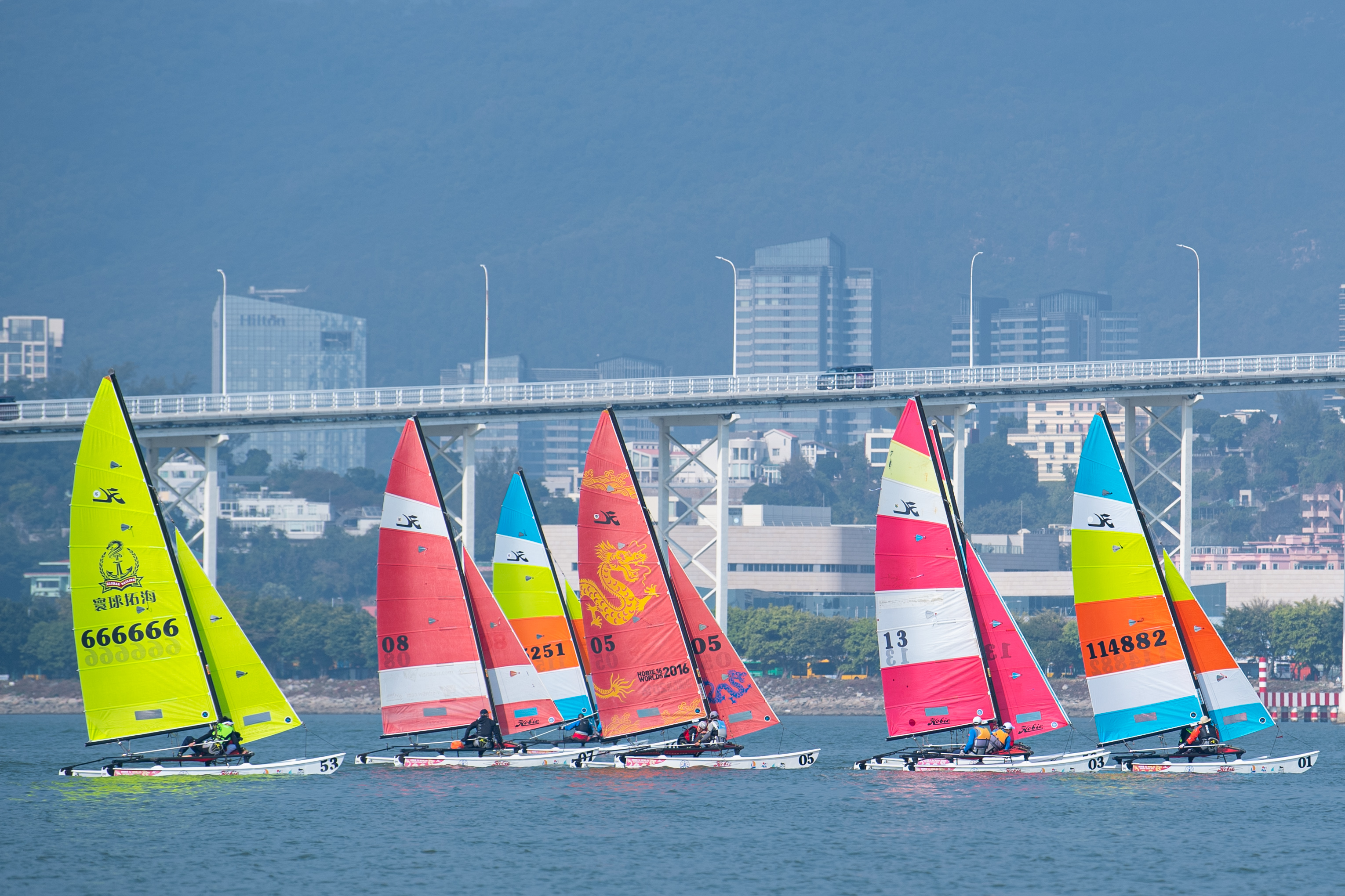 参赛选手在双体帆船国际邀请赛Hobie 16统一设计组比赛中。(新华社)