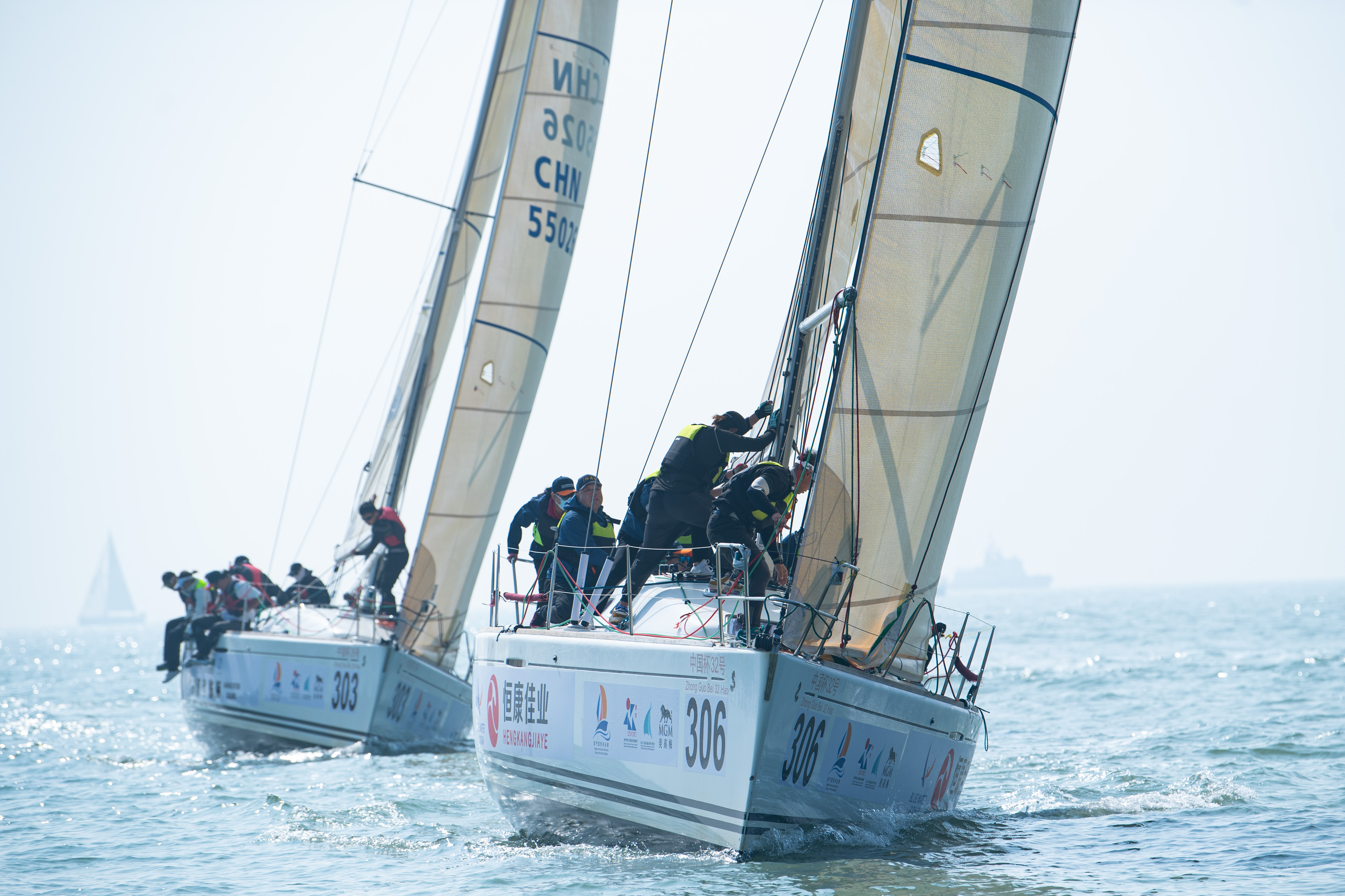 深蓝航海队 (右)在澳门杯国际帆船赛博纳多First 40.7统一设计组比赛中。(新华社)