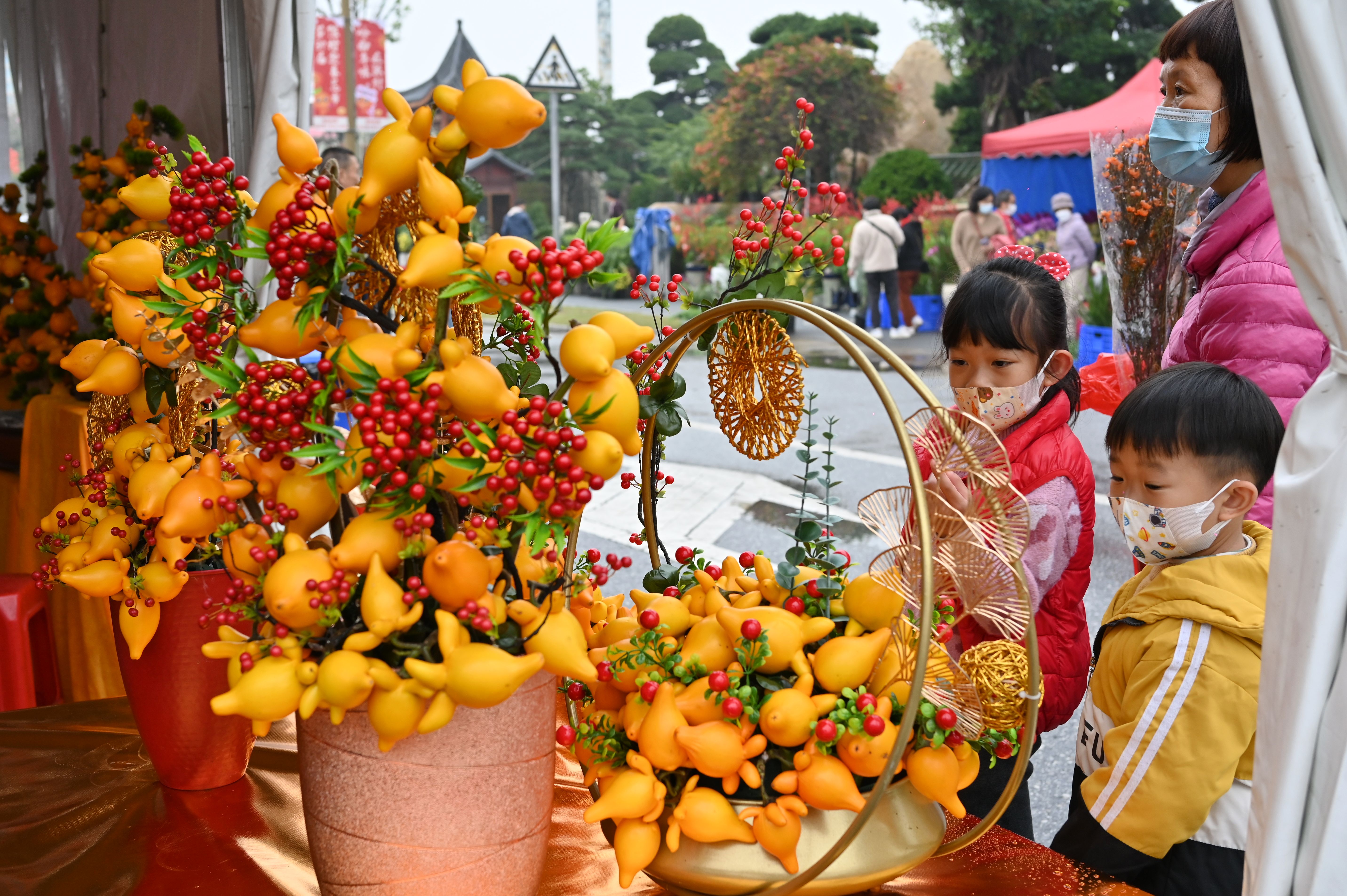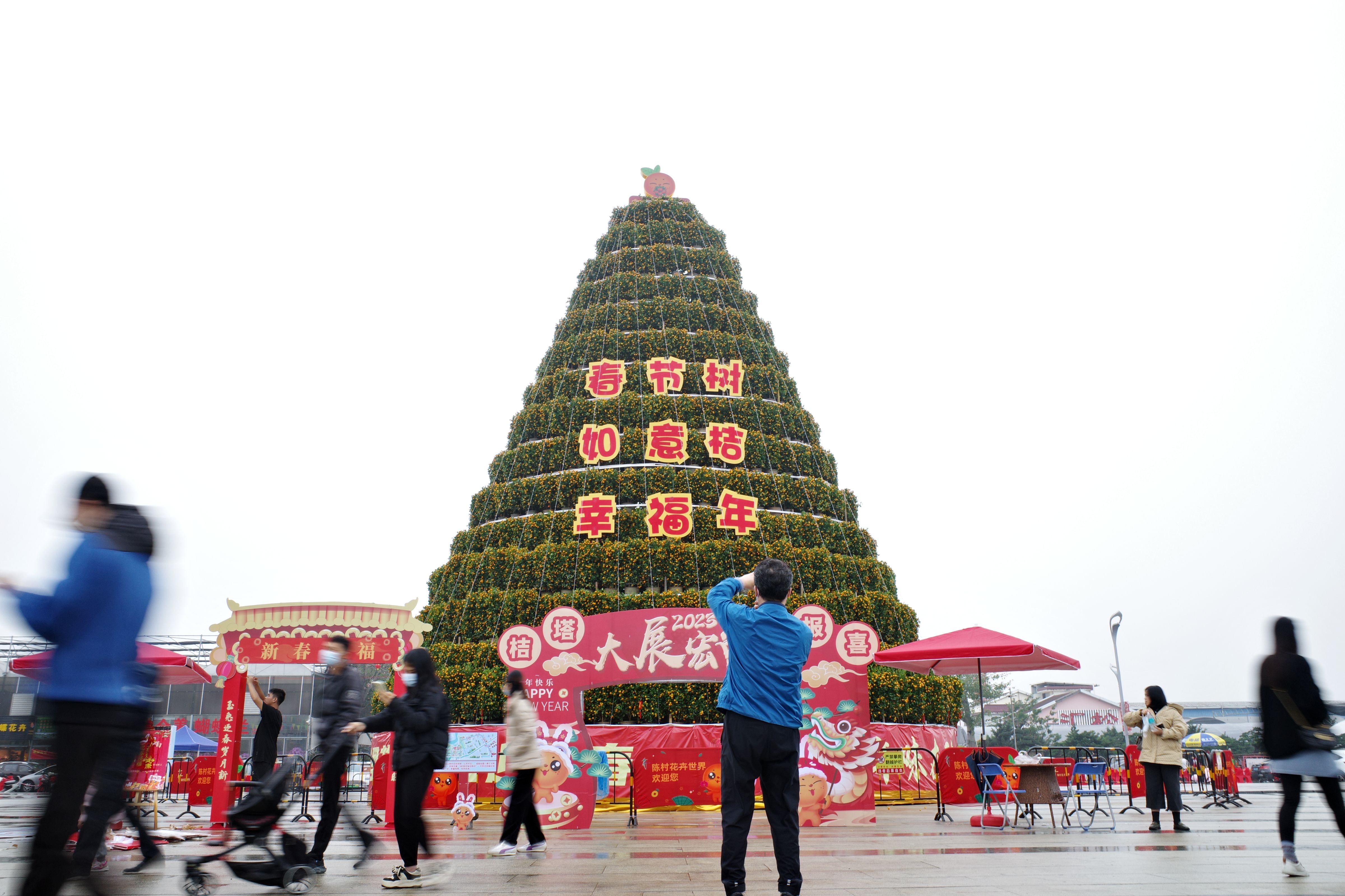 第39届陈村迎春花市展示的年桔塔吸引民众。(中新社)