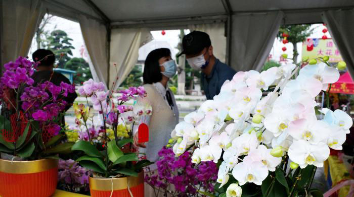 第39届陈村迎春花市一摊位的蝴蝶兰吸引民众。(中新社)