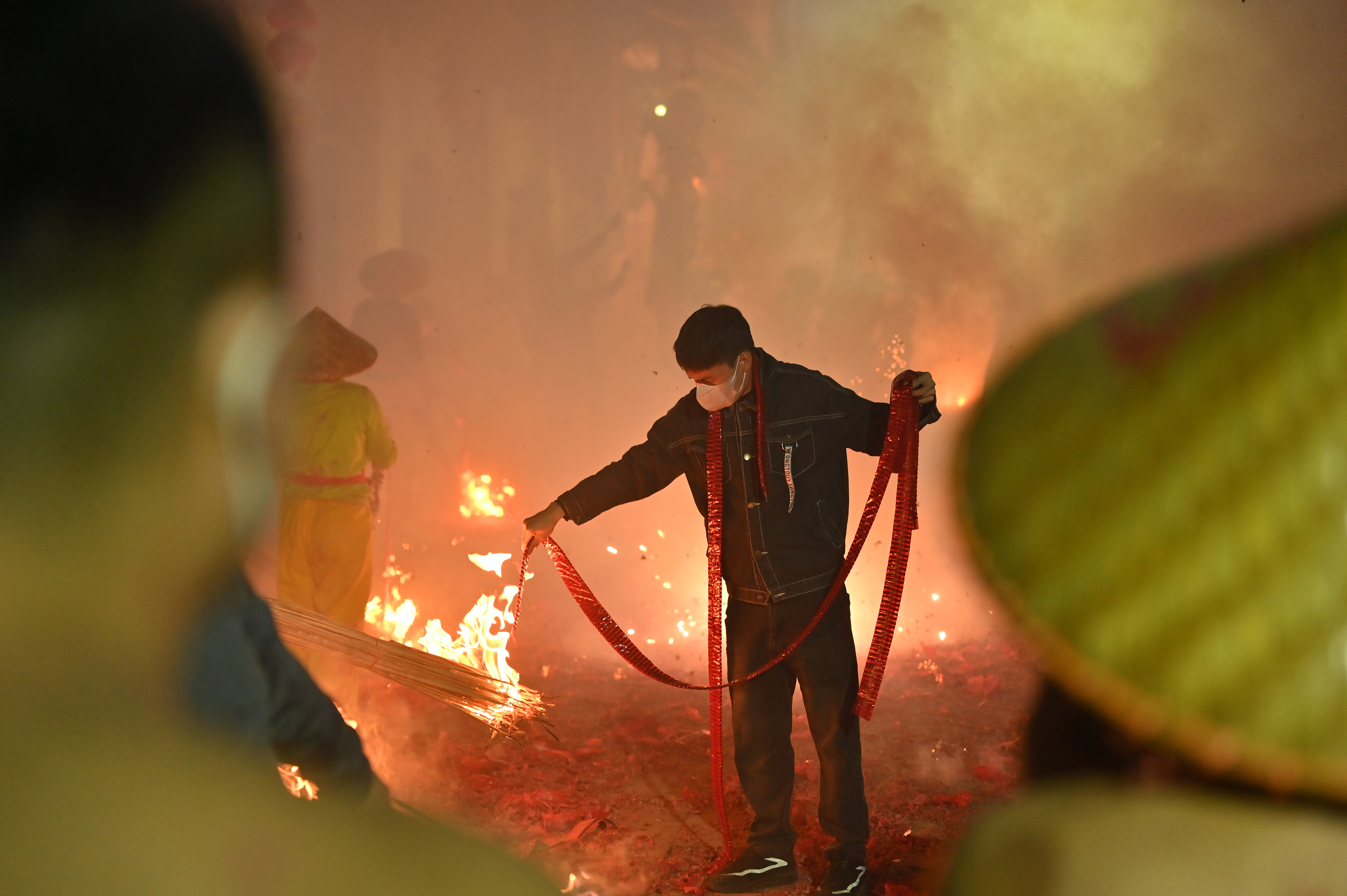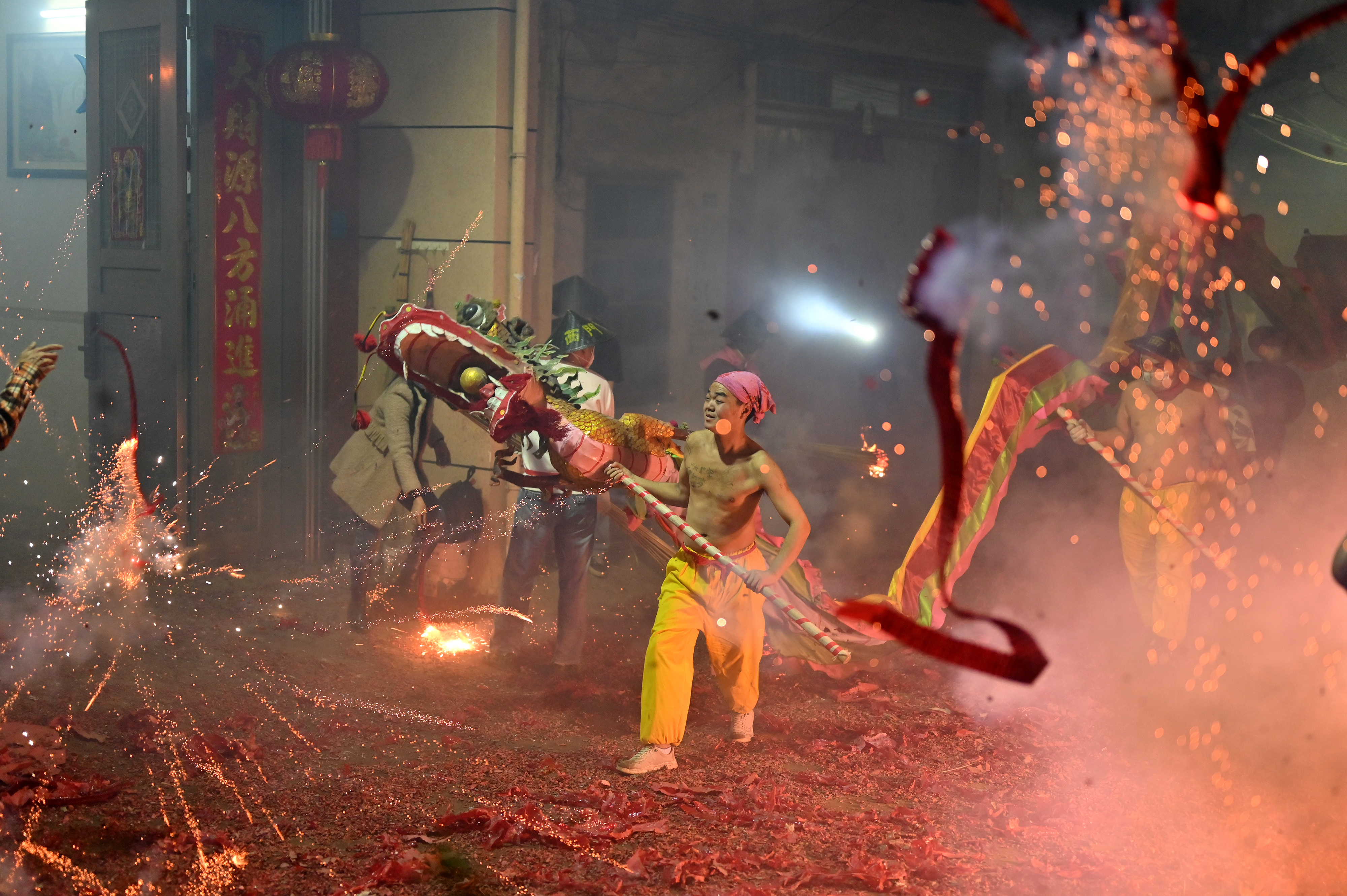 舞龙者穿行炮仗间,欢庆新春。(中新社)