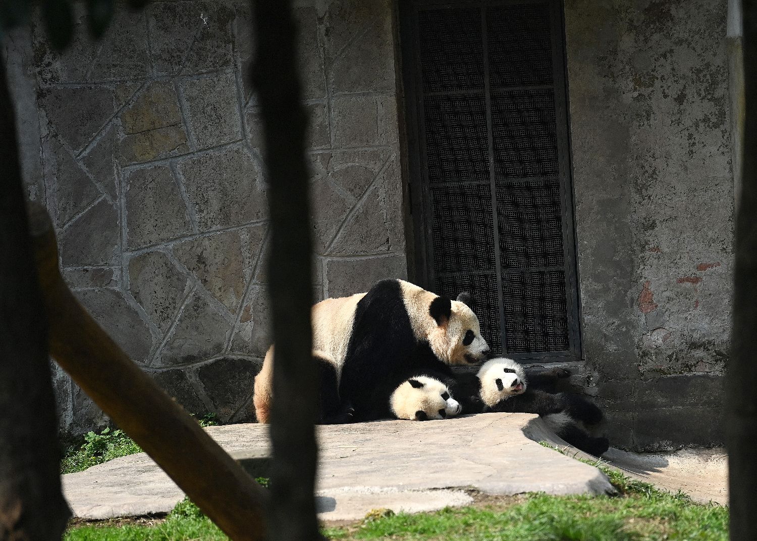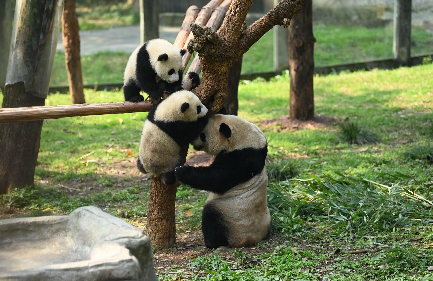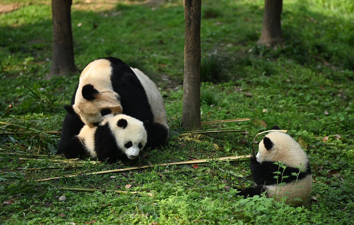 大熊猫“二顺”与双胞胎宝宝玩耍。(中新社)