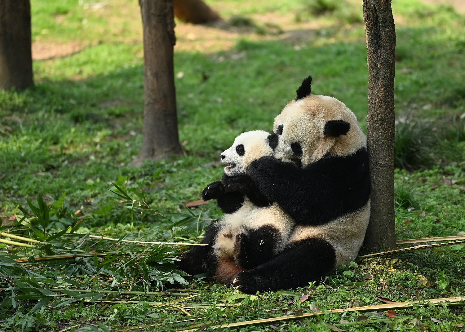 大熊猫“二顺”与宝宝玩耍。(中新社)