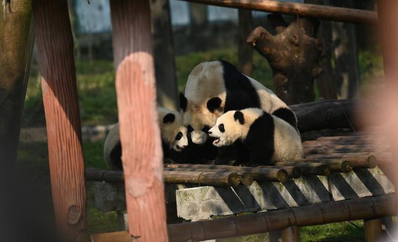 重庆动物园3月15日向外界公布,经过网络投票,旅加大熊猫“二顺”龙凤胎宝宝的名字确定了,哥哥名叫“渝可”,妹妹名叫“渝爱”。据悉,“渝可”和“渝爱”两兄妹于2022年7月22日出生,出生时哥哥体重132克,妹妹体重91克,兄妹俩如今正在重庆动物园饲养员悉心照顾下茁壮成长。图为大熊猫“二顺”与双胞胎宝宝玩耍。(中新社)