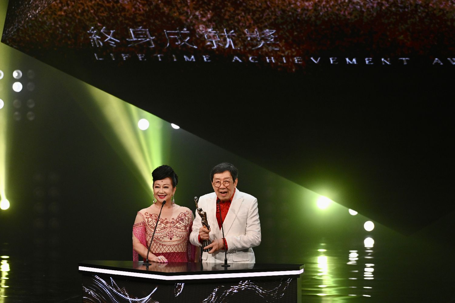 4月16日,香港电影金像奖协会于香港文化中心外举行第41届香港电影金像奖颁奖典礼的红地毯仪式。据悉,受疫情影响三年之后,2023年的第41届香港电影金像奖终于恢复完全的常态,无论是举办时间、举行场地,还是出席人员的熠熠星光都令人感受到电影回归的十足活力。图为胡枫(右)获得香港电影金像奖“终身成就奖”。 (中新社)