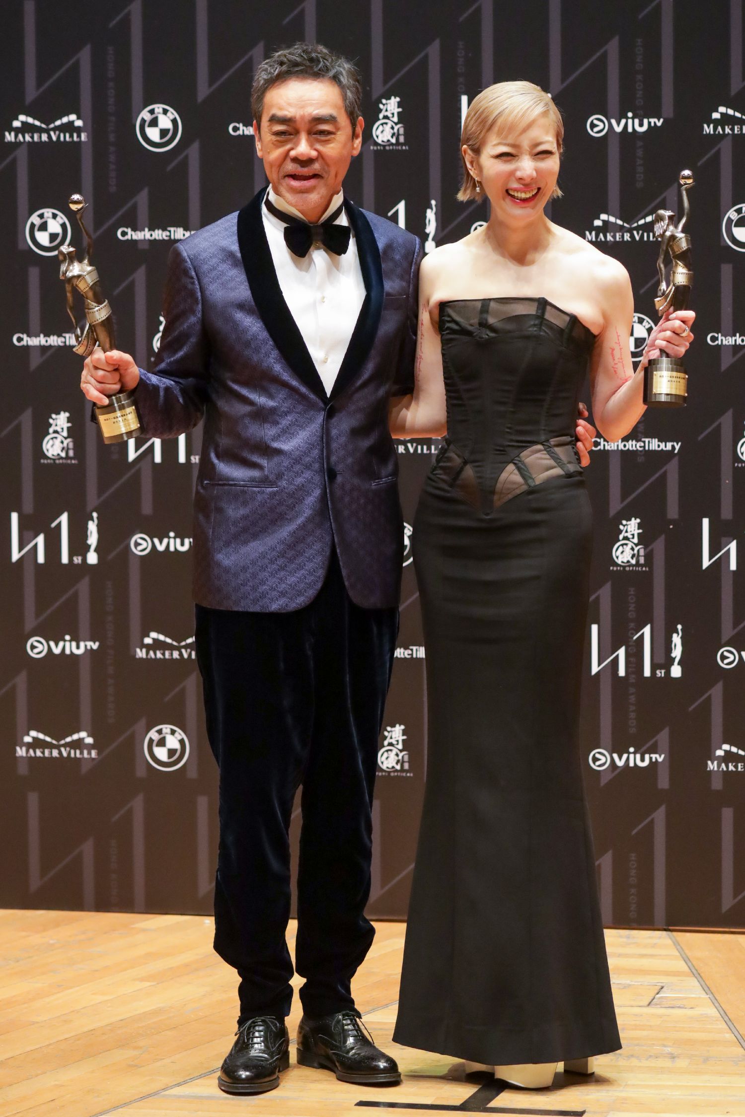 最佳女主角郑秀文(右)及最佳男主角刘青云合照。(中新社)