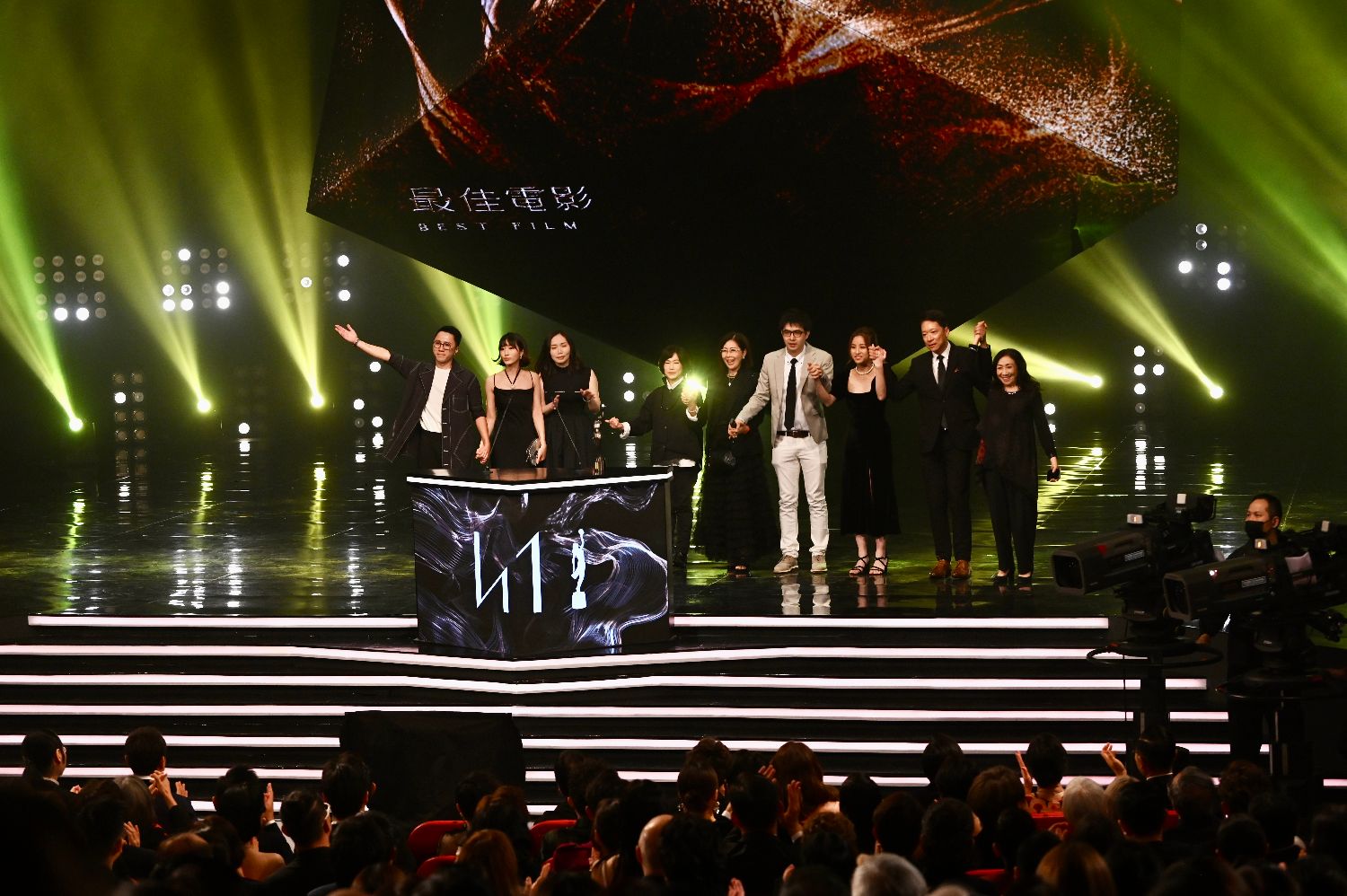 4月16日,香港电影《给19岁的我》夺得香港电影金像奖“最佳电影”。图为《给19岁的我》电影团队于台上感谢大家支持。 (中新社)
