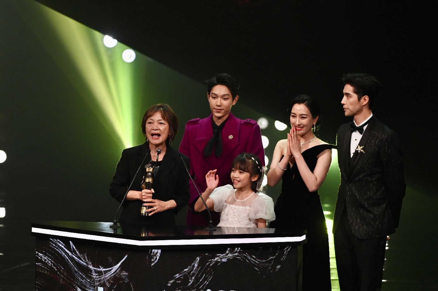 4月16日,内地电影《海的尽头是草原》夺第41届香港电影金像奖“最佳亚洲华语电影”。图为《海的尽头是草原》主创团队发表获奖感言。 (中新社)