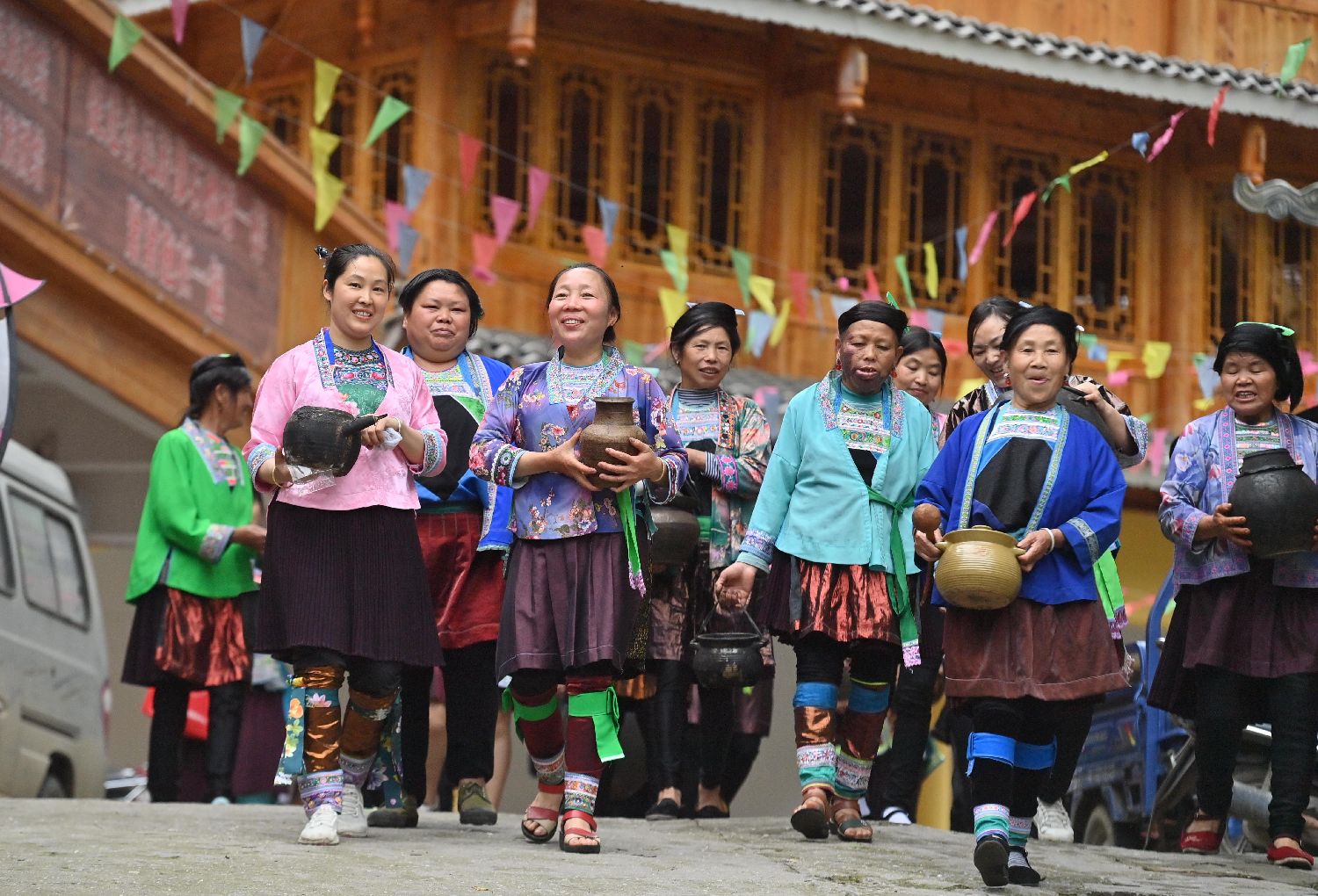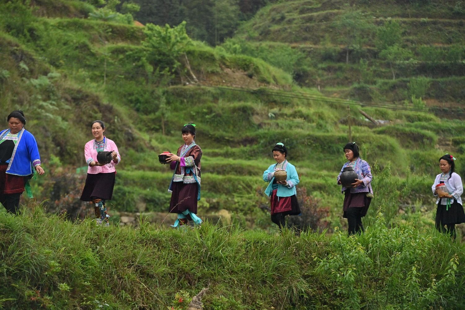 4月19日,在广西柳州市融水苗族自治县杆洞乡党鸠村乌英苗寨,妇女们提着陶罐去参加洗发护发活动。(中新社)