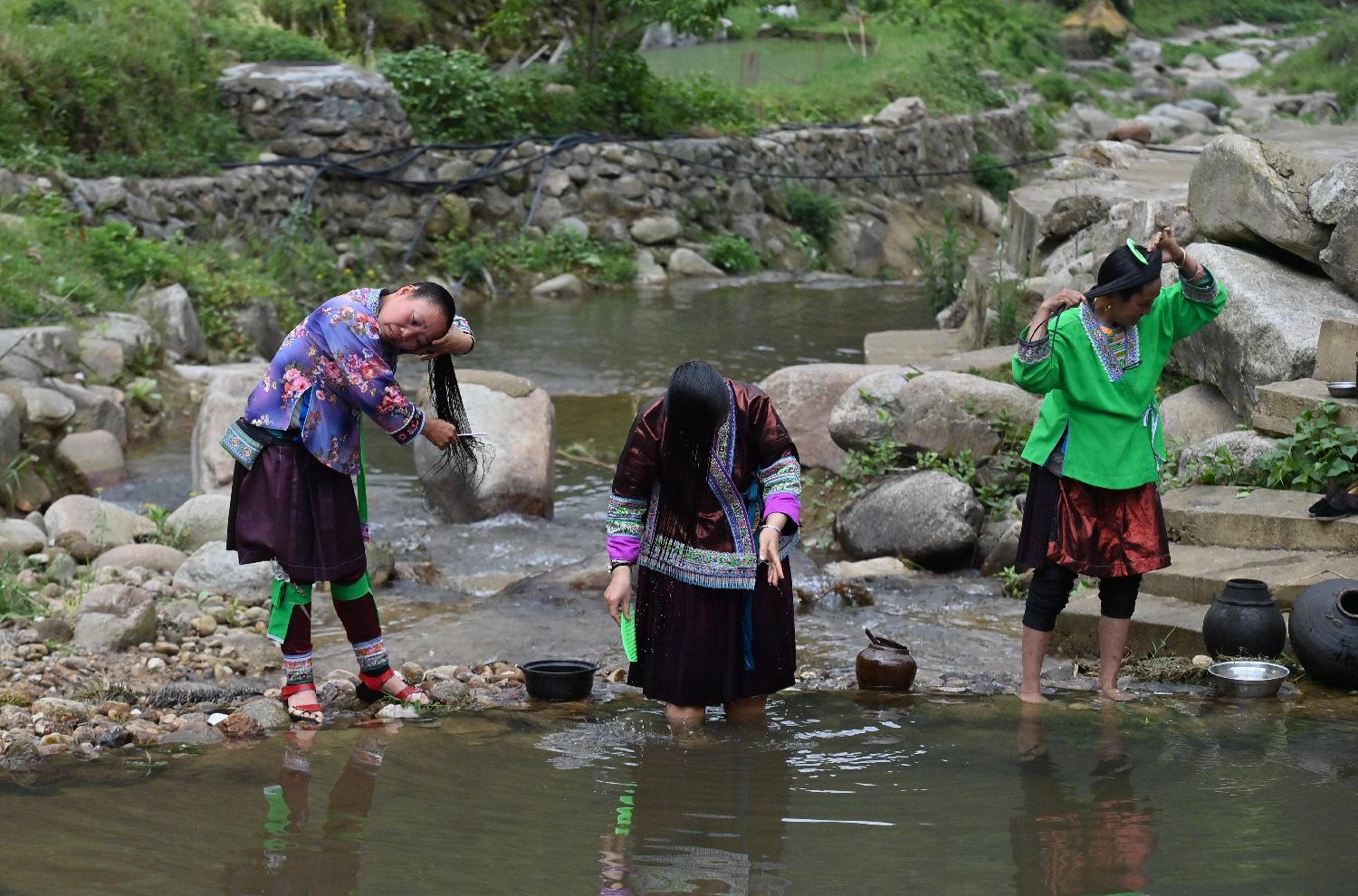 4月19日,在广西柳州市融水苗族自治县杆洞乡党鸠村乌英苗寨,妇女们在河里洗护头发。当日,中国广西柳州市融水苗族自治县在该县杆洞乡党鸠村乌英苗寨开展第二届淘米水开坛洗发文化节活动,苗族妇女们开展长发梳妆、洗发护发等活动,展示当地少数民族用淘米水洗头的传统养发文化。乌英苗寨地处大苗山深处,当地妇女有用淘米水洗头的传统。她们将淘米水收集到陶罐中,经火塘烘烤加热发酵后,再用来洗头发,以养护长发保持乌黑亮丽。(中新社)