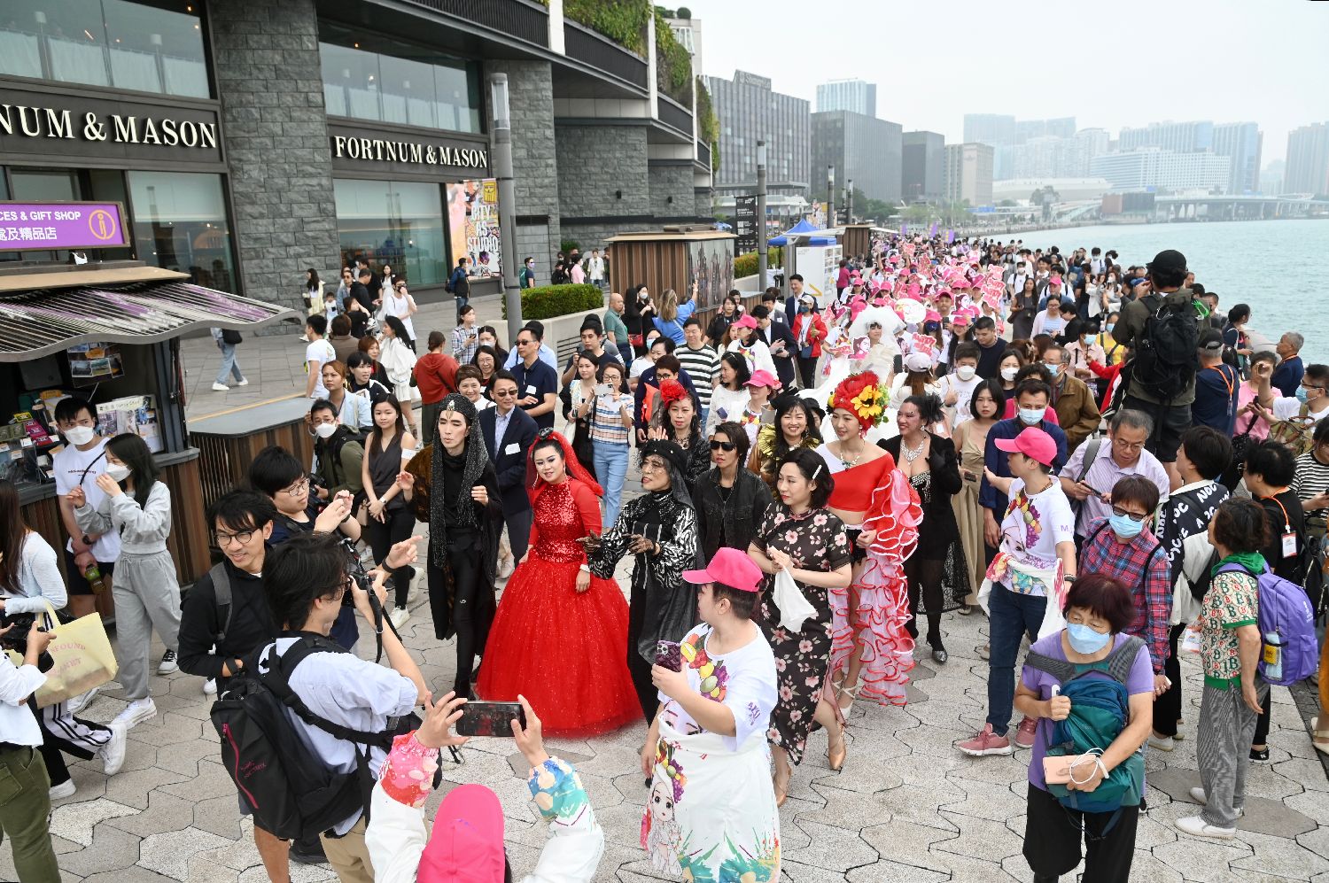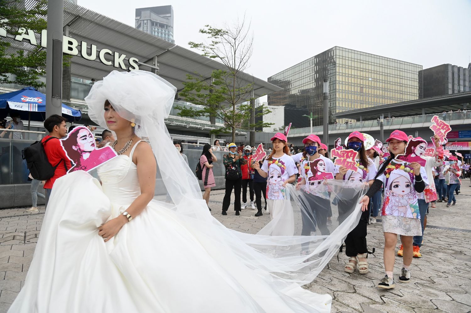 活动吸引逾300名巨星的歌影迷会成员及大批香港市民、游客参与。图为巡游人士身穿婚纱向梅艳芳的演唱会造型致敬。(中新社)
