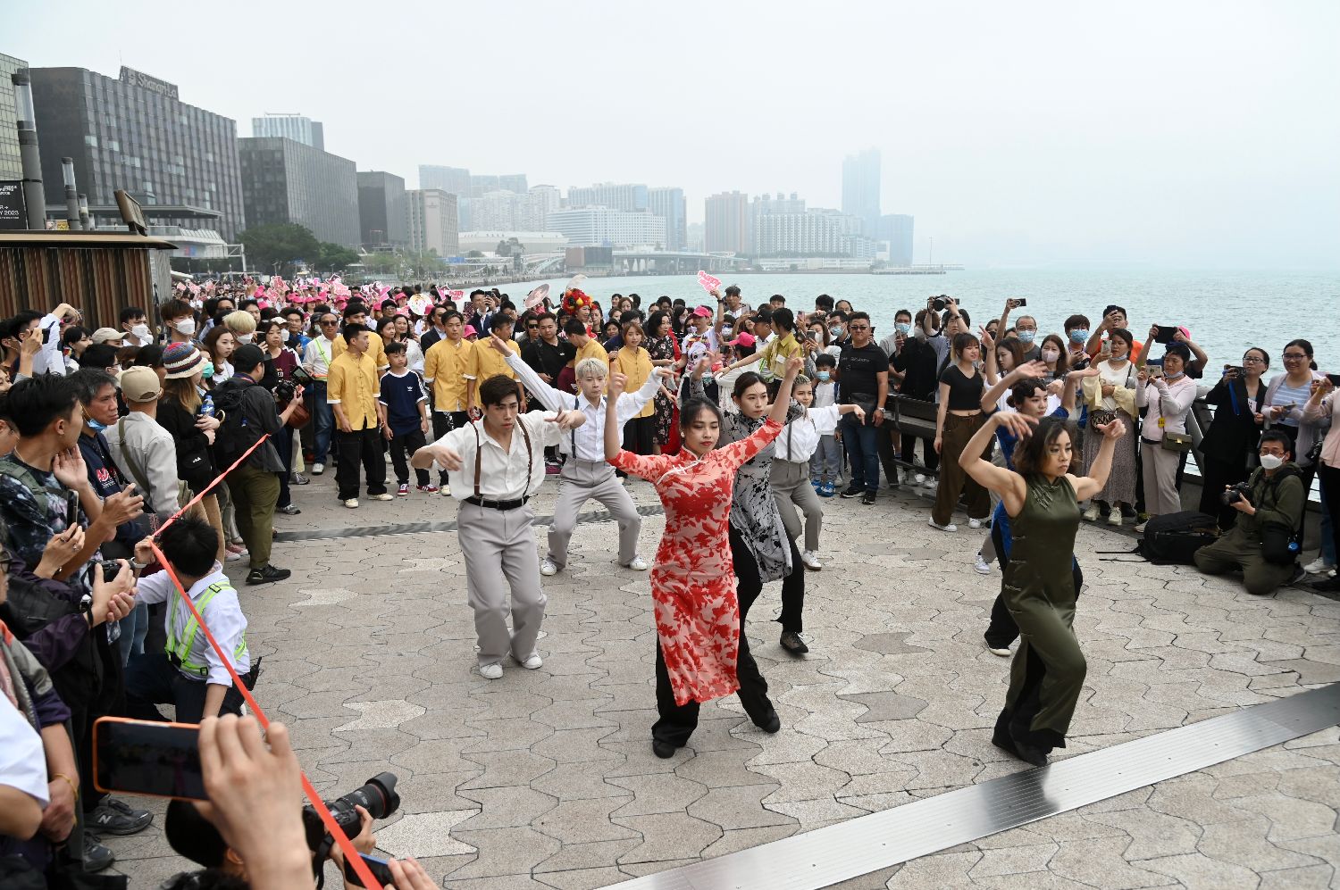 4月23日,霹雳舞巡游暨巨星展览“星光声·影梦”在香港尖沙咀星光大道举行,活动以崭新编曲及霹雳舞等元素,向香港已故巨星李小龙、梅艳芳、张国荣、陈百强致敬,并推广香港流行文化。图为舞蹈员以舞蹈向巨星致敬。(中新社)