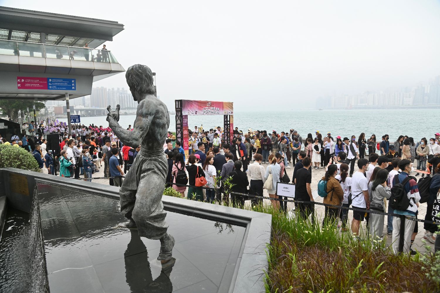 李小龙铜像与香港星光大道霹雳舞巡游活动。(中新社)