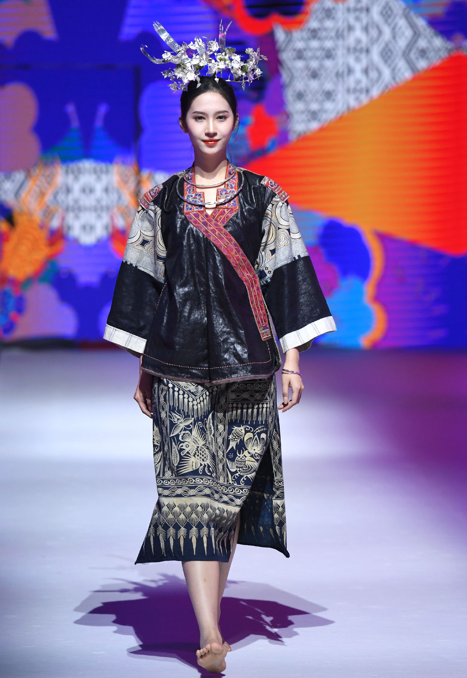 4月24日,2022年“锦绣云裳·美丽南宁”民族服饰创意大赛颁奖仪式暨2023年“壮族三月三”民族服饰展秀活动在广西文化艺术中心举行,一件件绚丽多彩、精美绝伦的壮族民族元素服饰在T台上不断呈现,为观众献上了一场极具魅力的视觉盛宴。图为模特在展示民族元素服饰。(新华社)