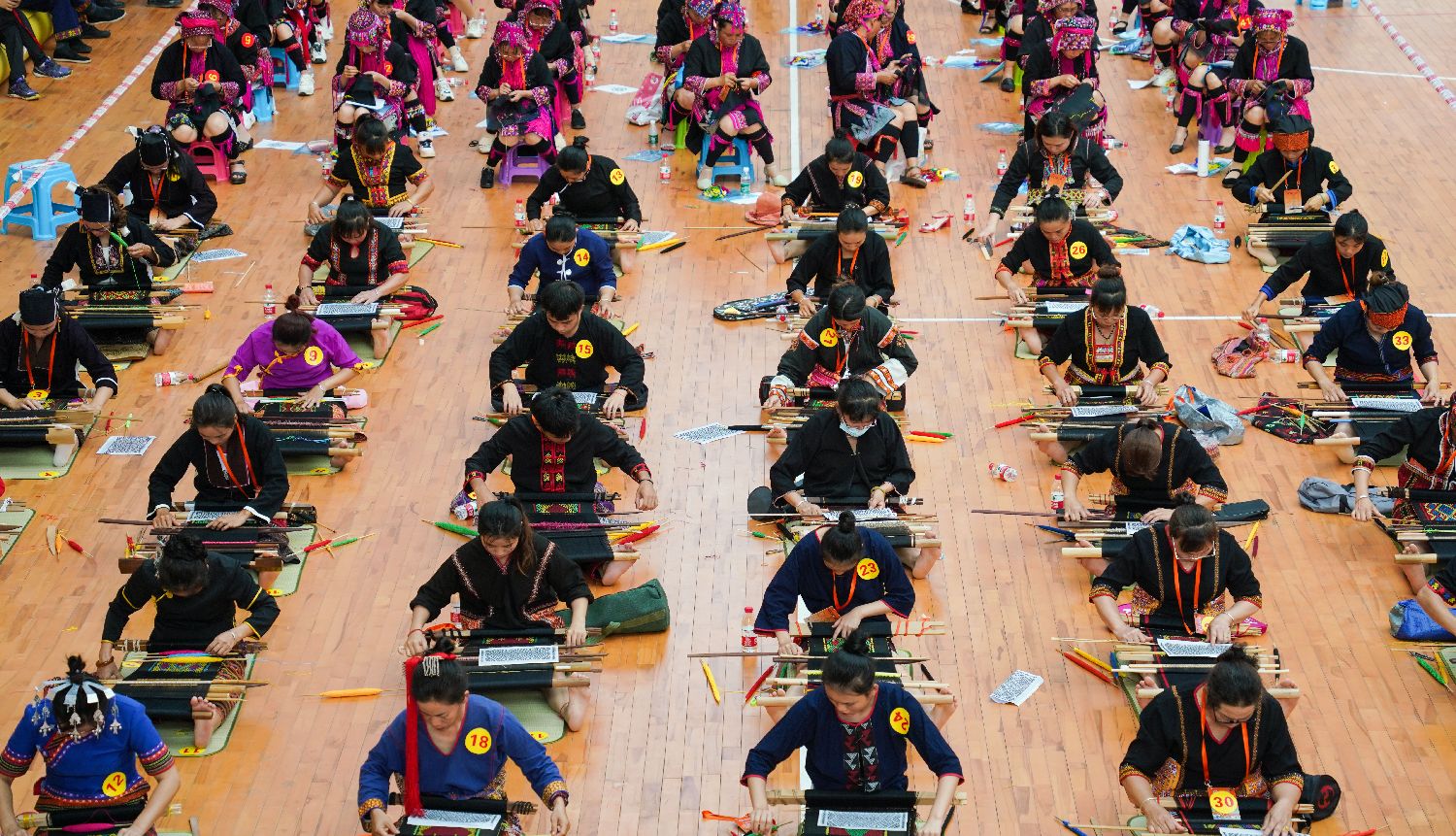 4月23日,在海南省乐东黎族自治县,当地民众通过参加民歌对唱比赛、黎锦苗绣技艺比赛等丰富多彩的民俗活动,欢庆传统节日“三月三”。图为黎锦苗绣技艺比赛现场。(新华社)