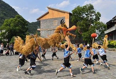 4月23日,为庆祝“三月三”,贵州省黔西南布依族苗族自治州册亨县冗渡中学初中一年级的学生在威旁村陂鼐布依古寨表演“布依山龙”。(CFP)